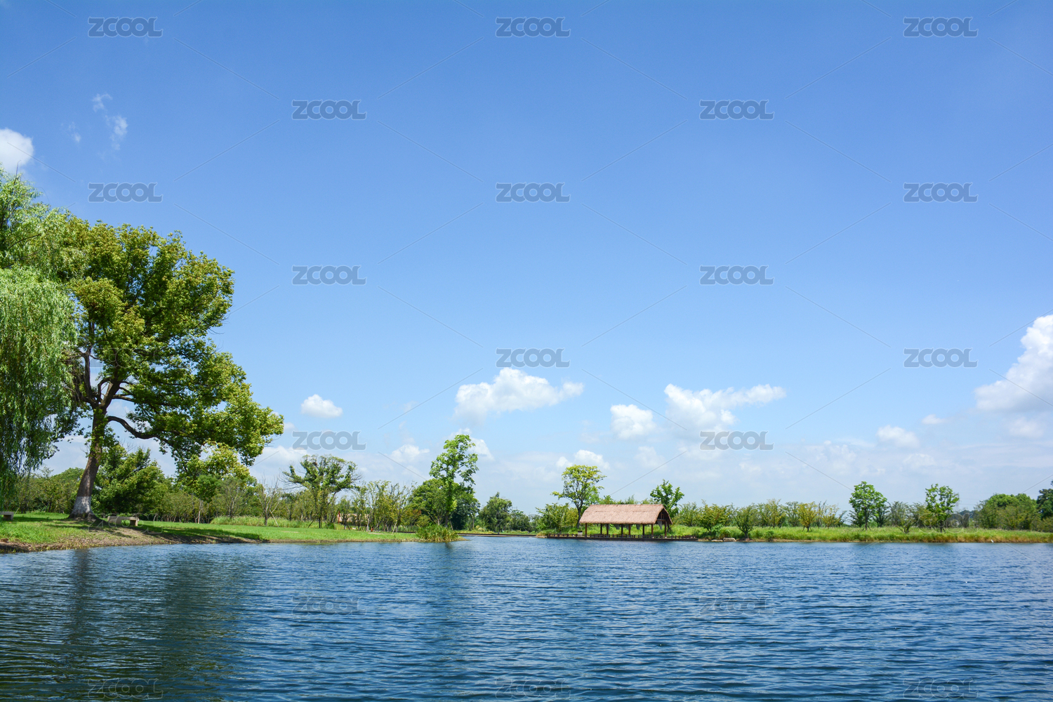 夏天公园里的湖泊和绿树