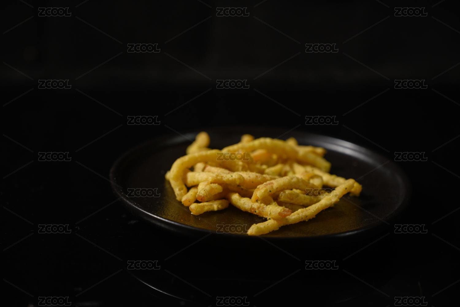 桌面上的盘子里的美味可口的油炸鱿鱼丝