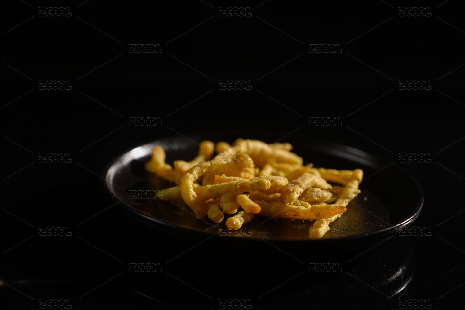 桌面上的盘子里的美味可口的油炸鱿鱼丝
