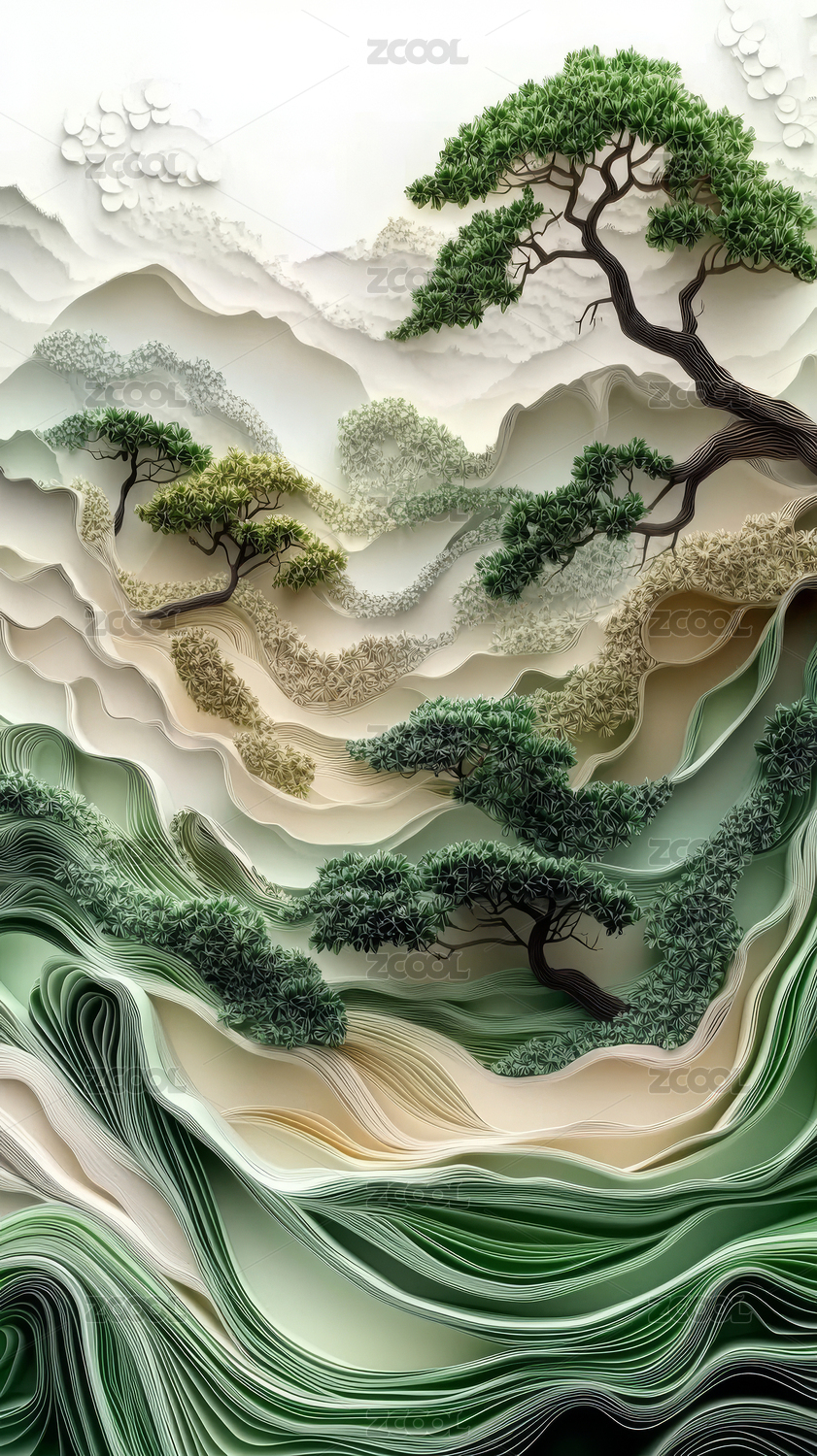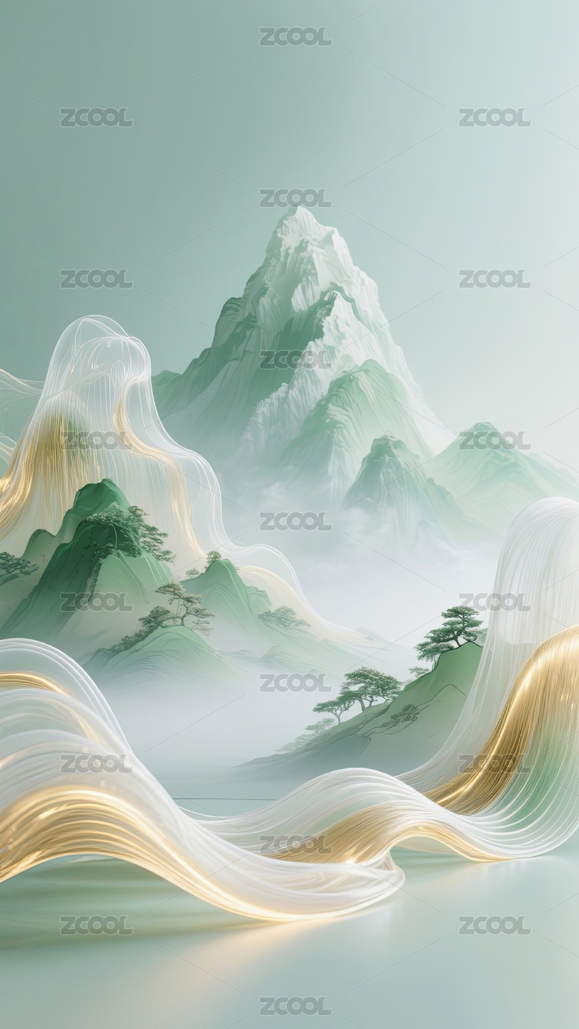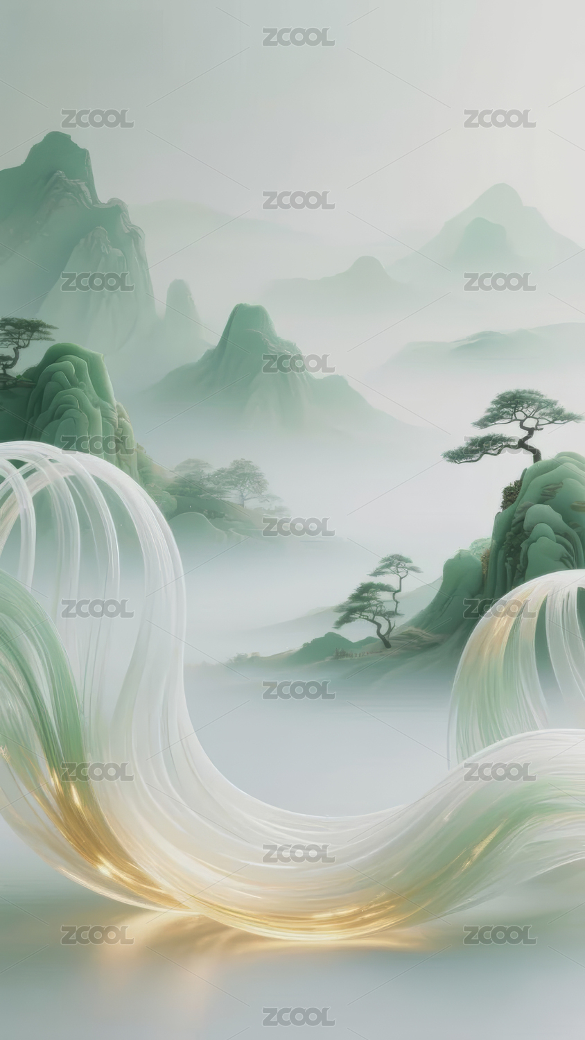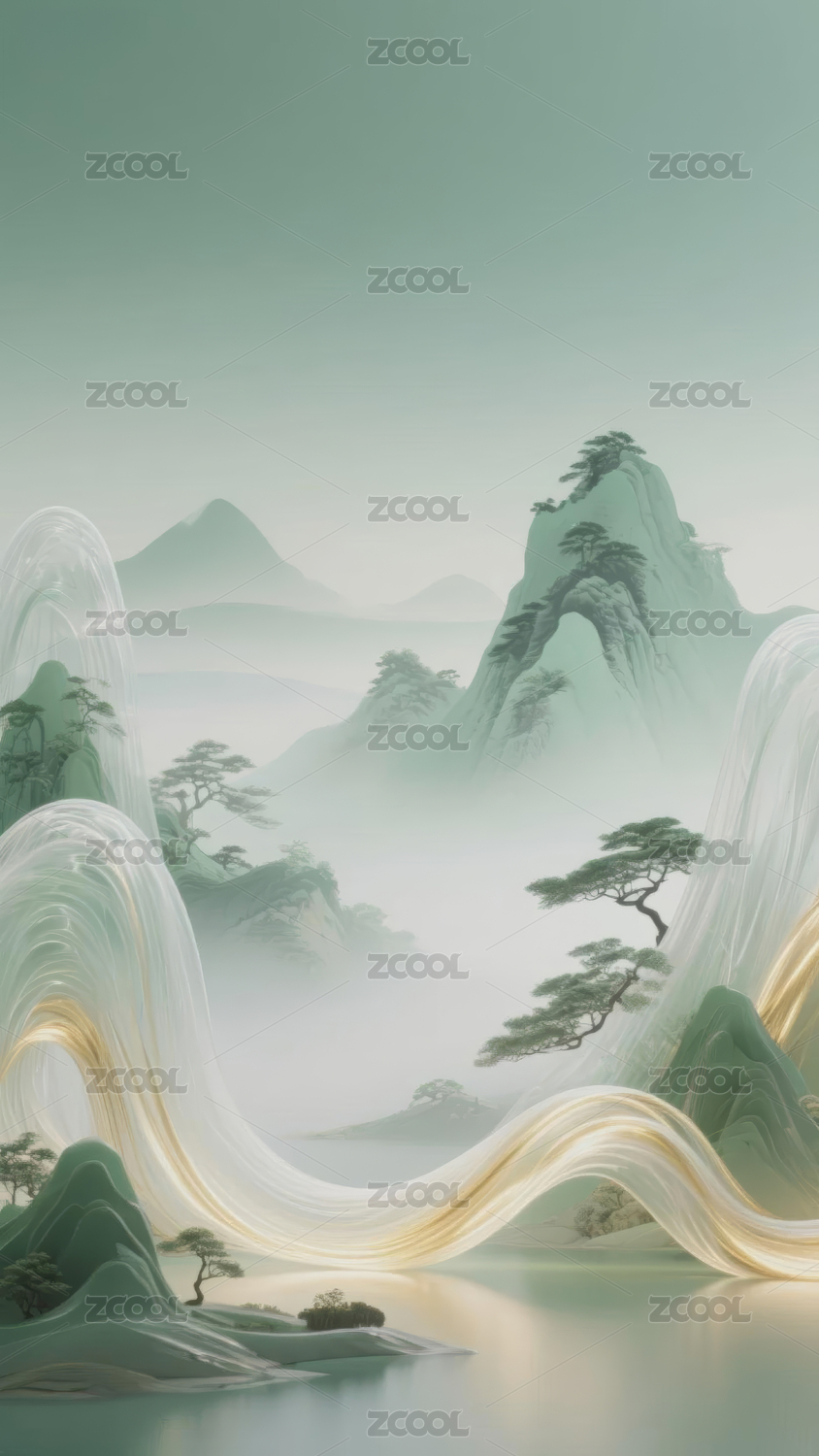 山水,水纹,绿色,风景,插画,自然,流动,水系,艺术,山水画