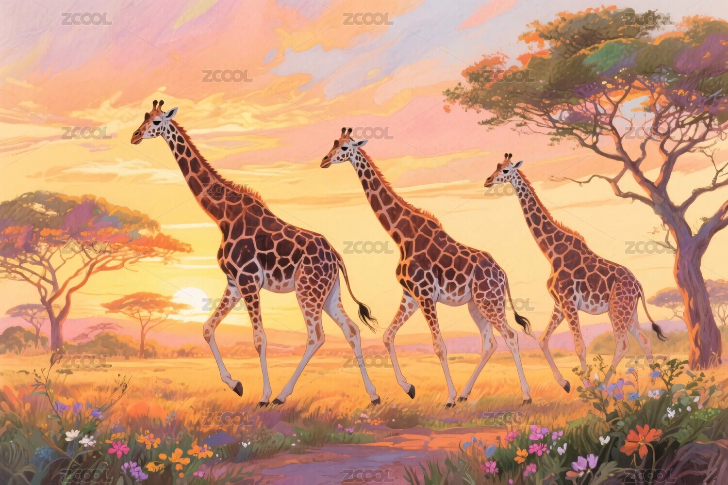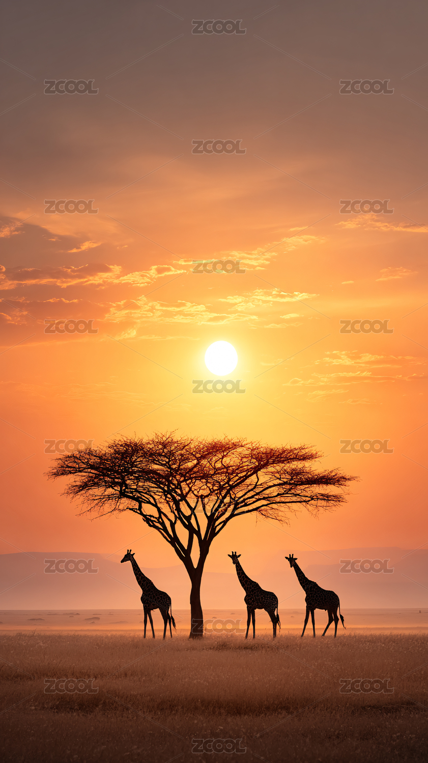 长颈鹿,夕阳,草原,树木,动物,自然景观,黄昏,天空,晚霞,画面