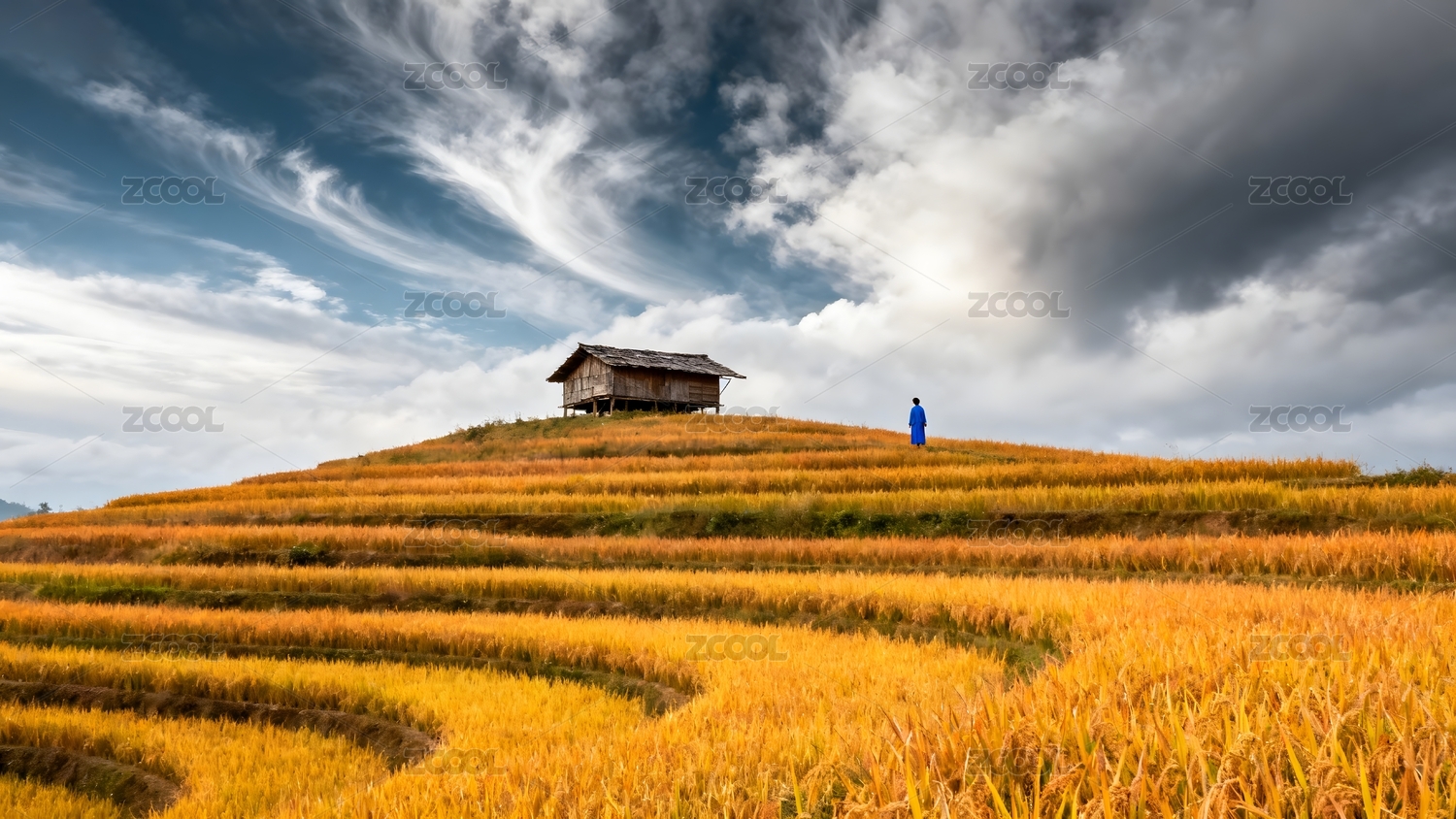 天空,日落,夕阳,晚霞,房屋,自然,乡村,山脉,梯田,稻田