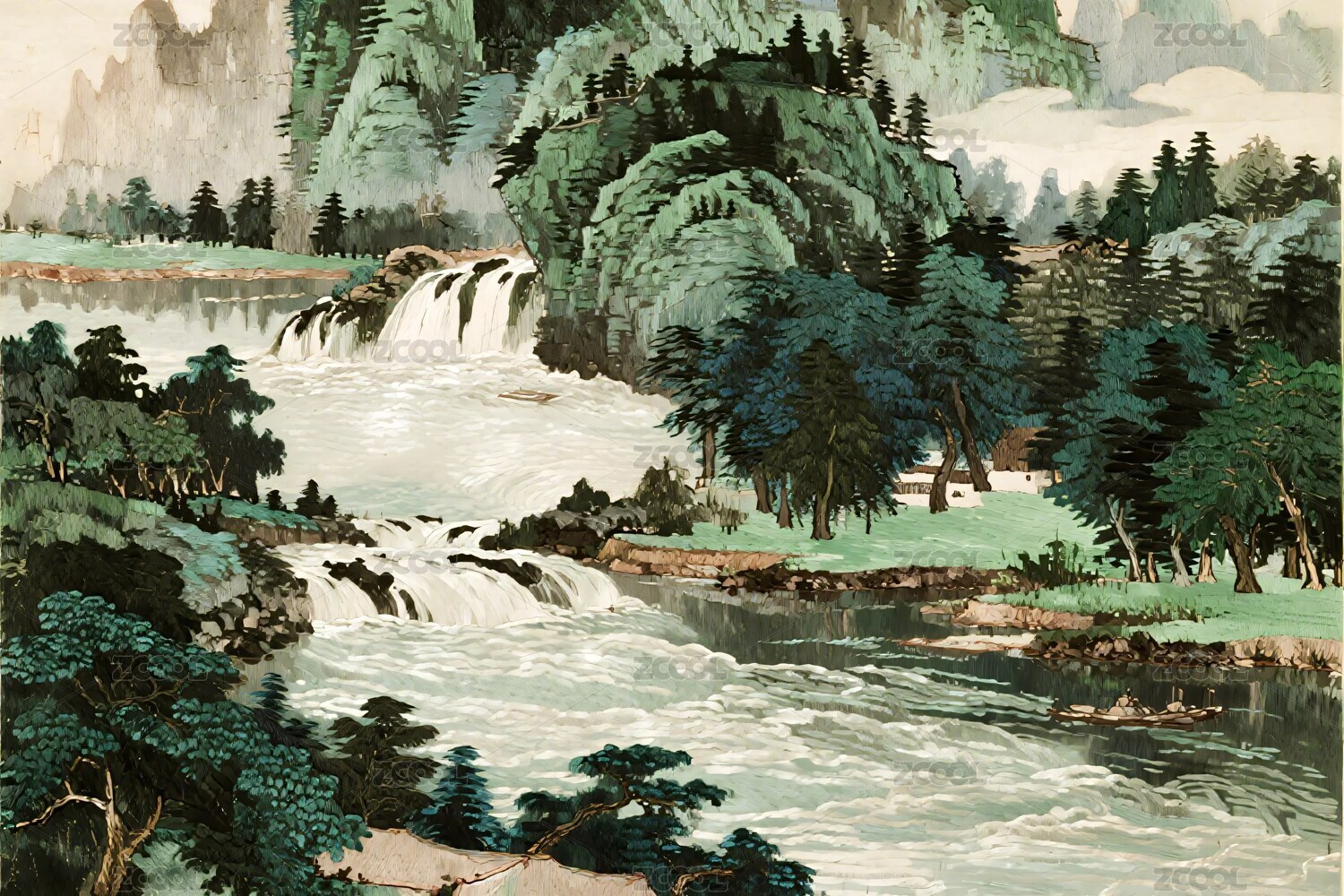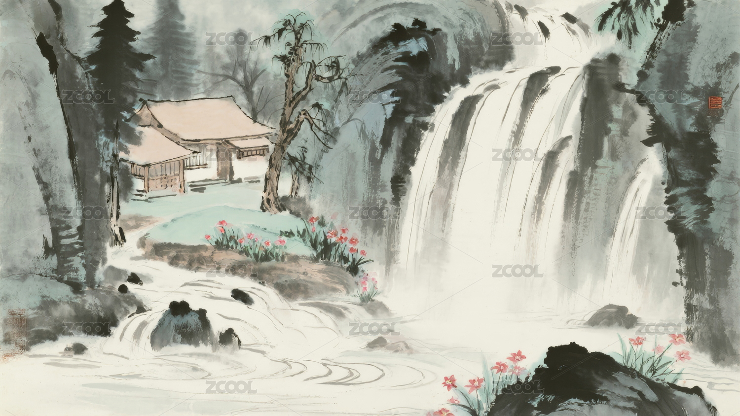 山水,瀑布,樱花,山水画,水墨,国画,流水,岩石,鲜花,自然