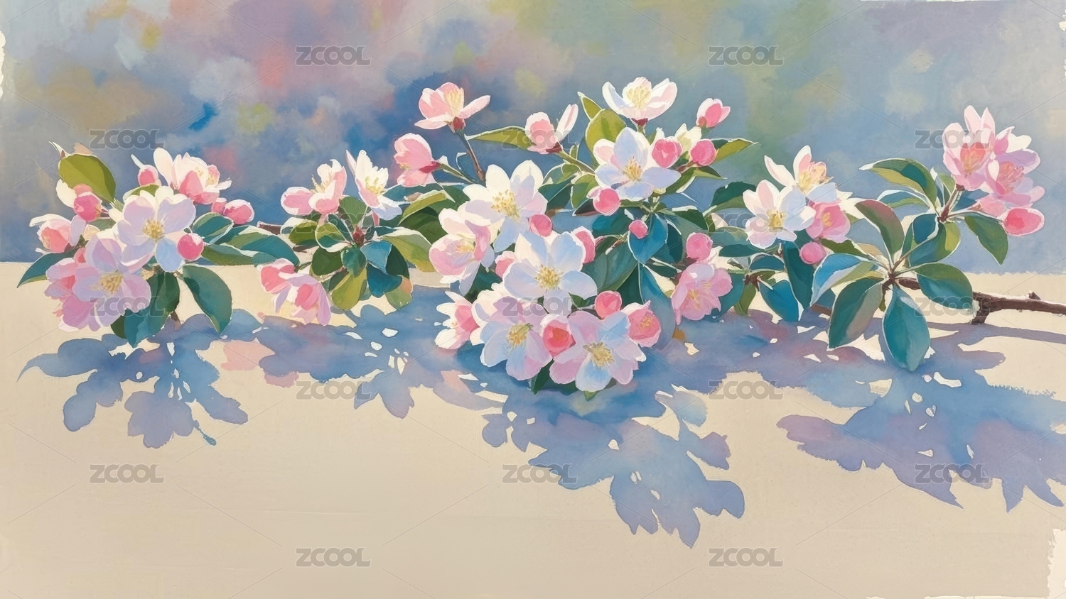 樱花粉白插画蓝天背景