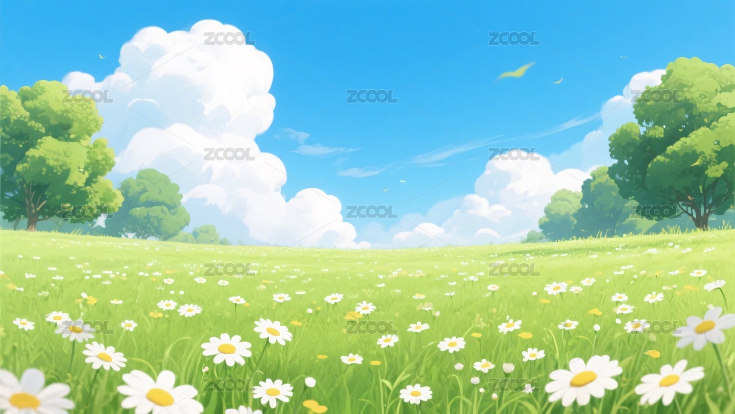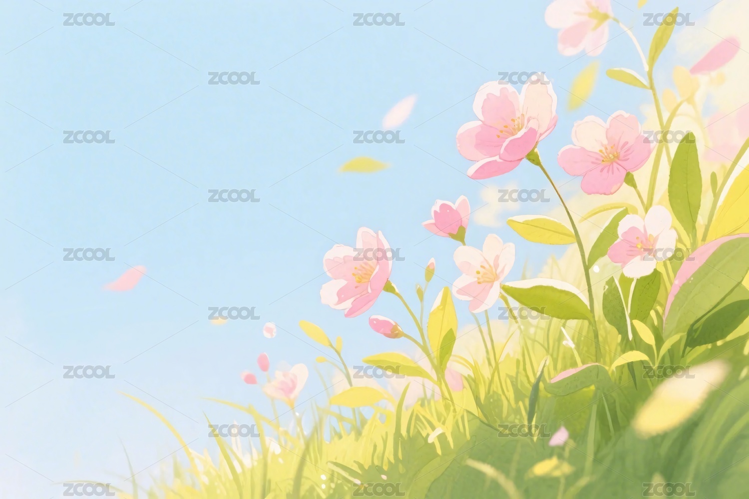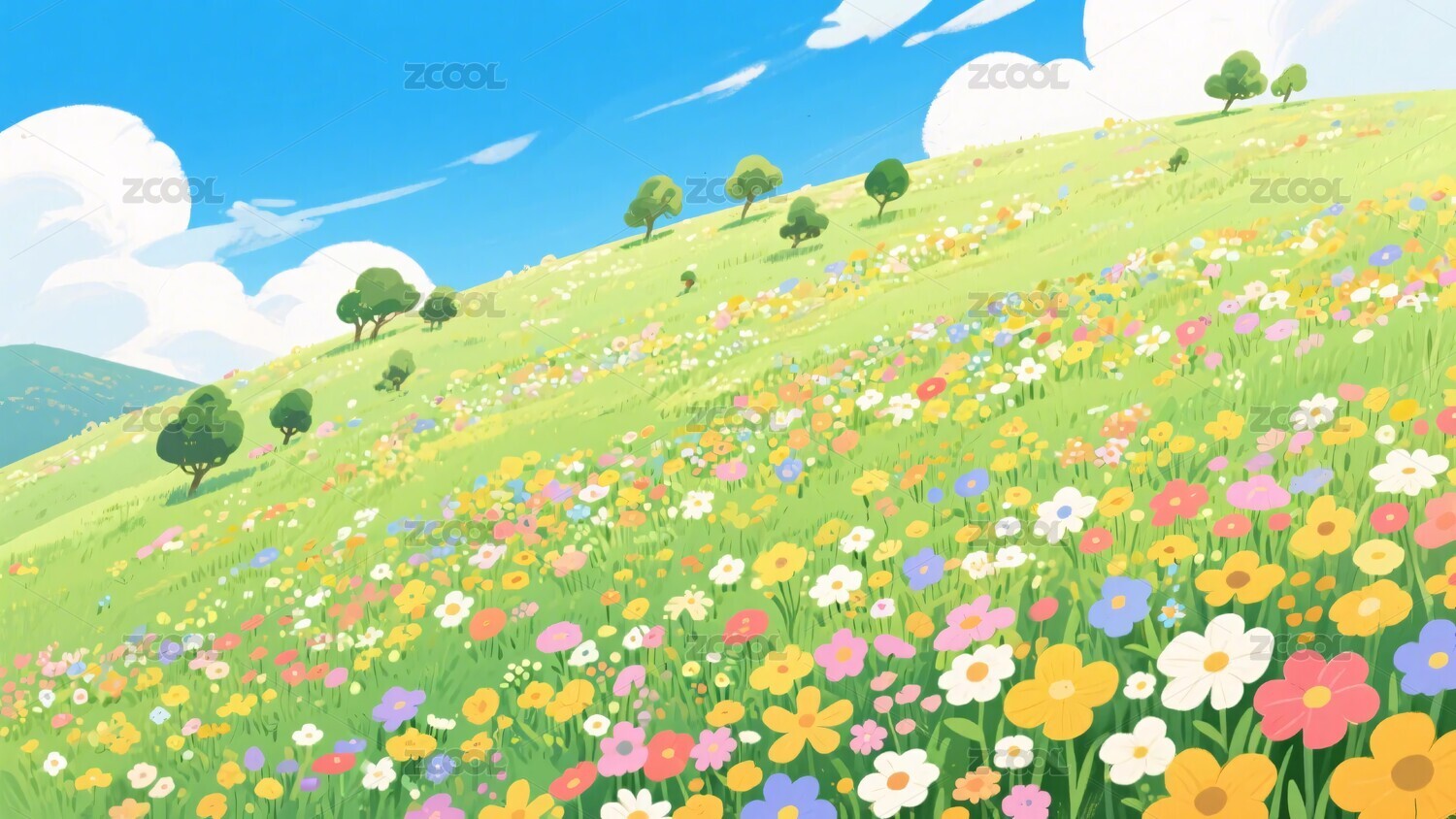 蓝天,白云,黄花,花草,春景,田园,插画,矢量,自然风景,清新