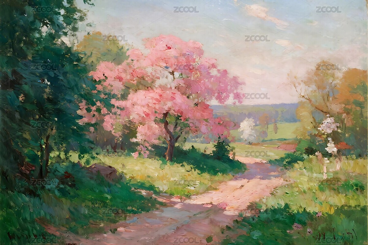 田园,小径,粉色树木,自然,油画,风景,绘画,色彩,绿地,道路