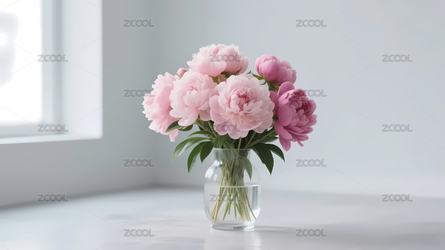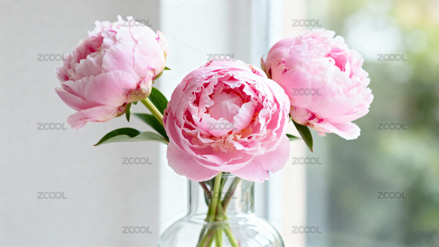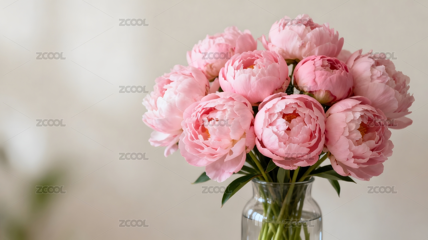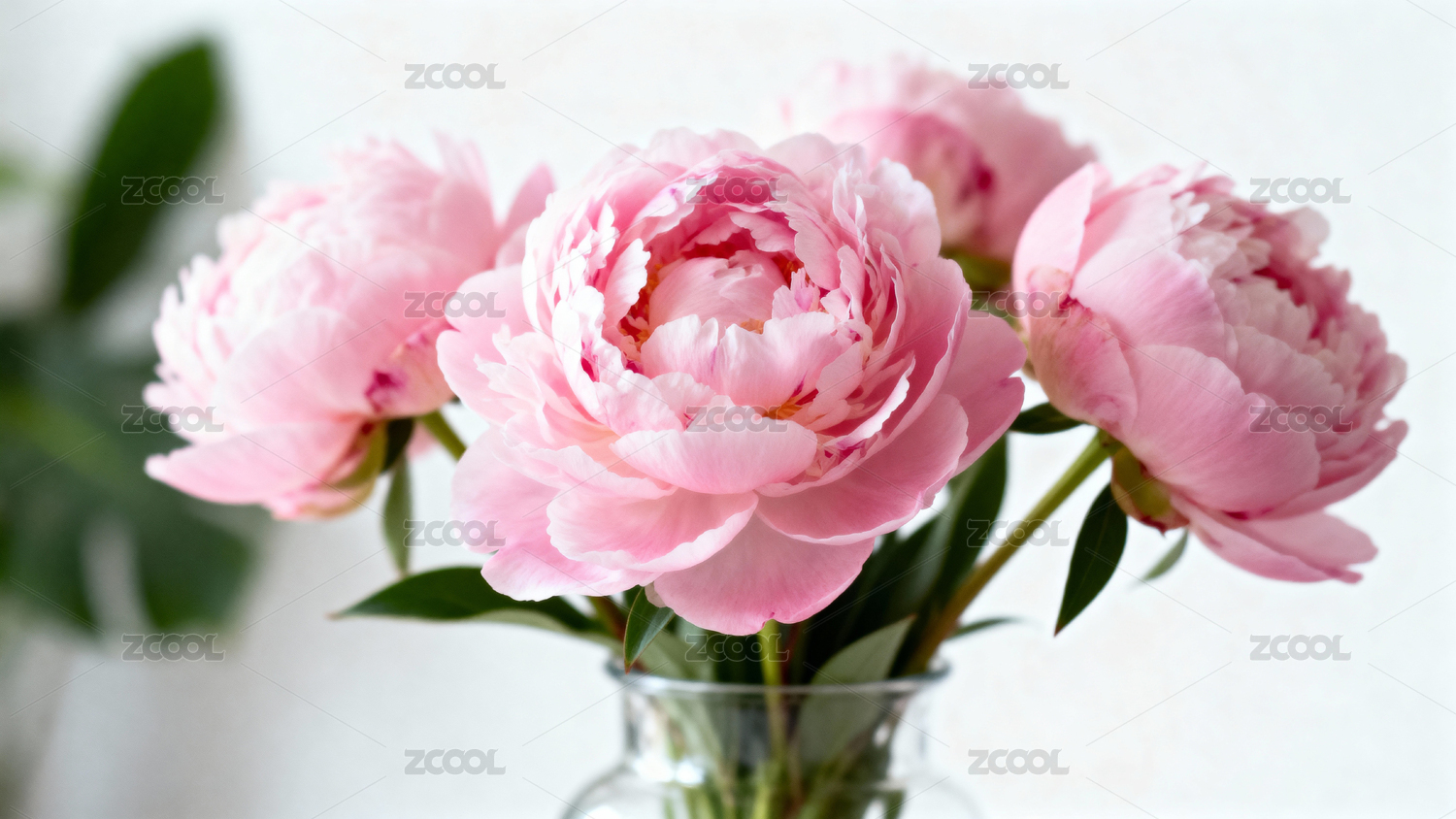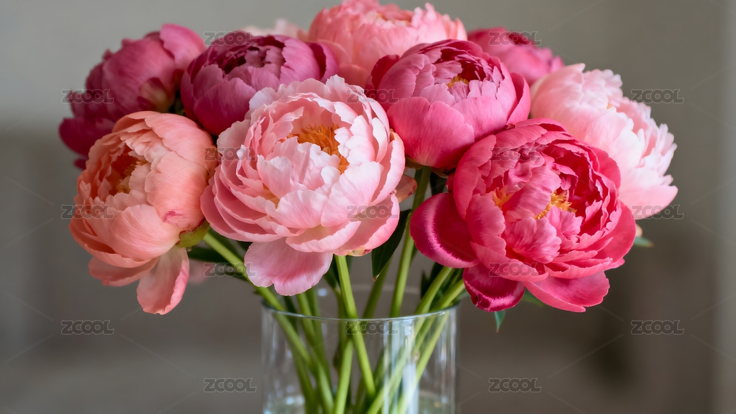 粉色牡丹花束置于透明花瓶中