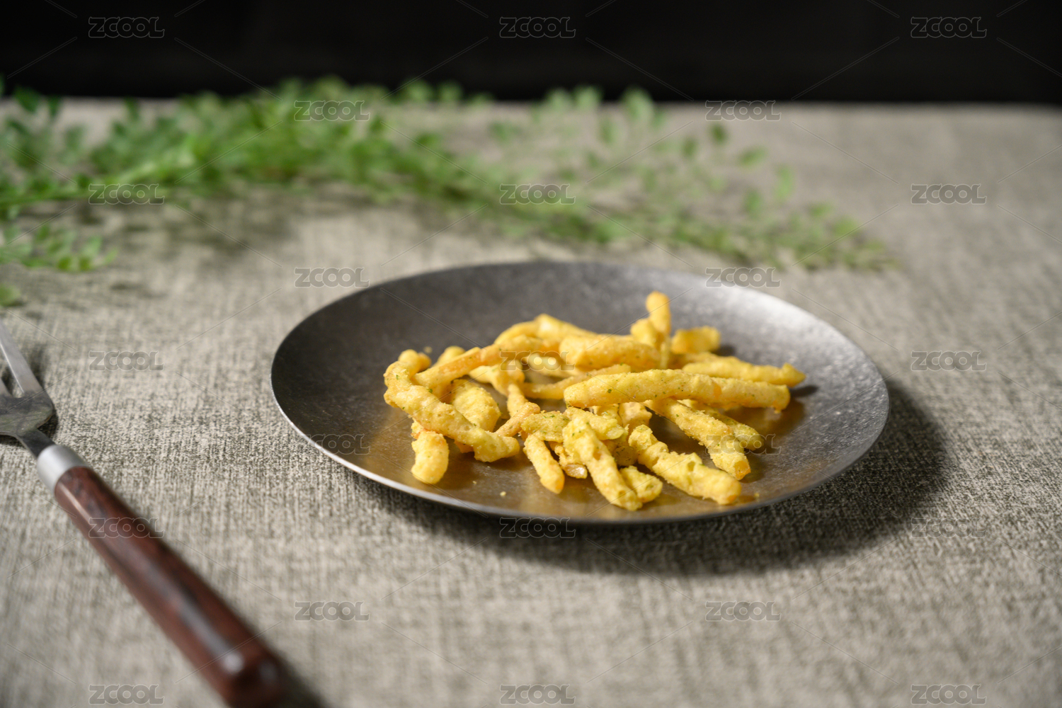桌面上的盘子里的美味可口的油炸鱿鱼丝