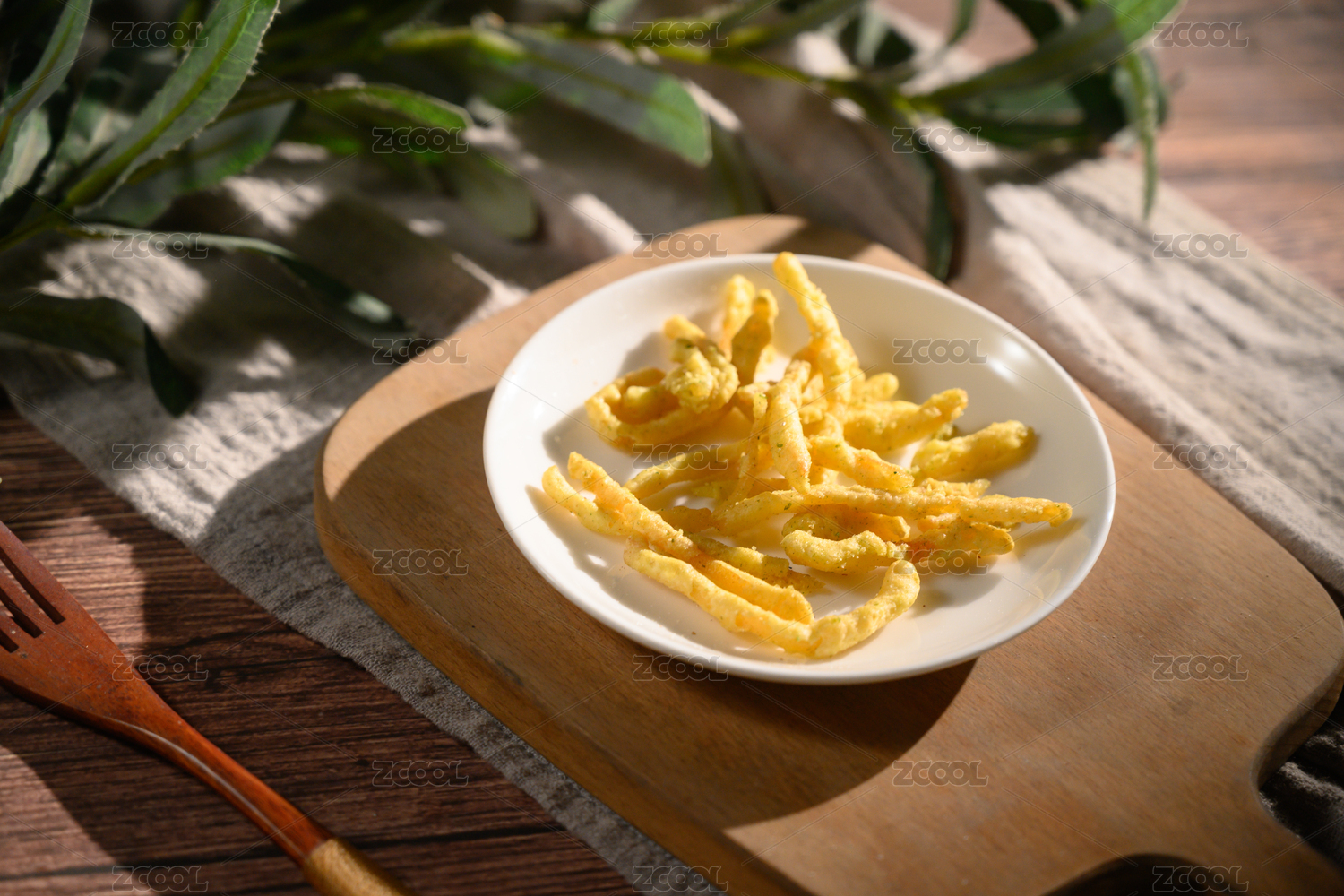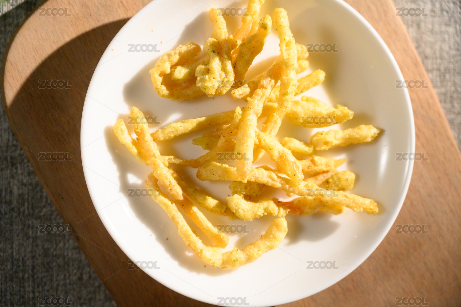 桌面上的盘子里的美味可口的油炸鱿鱼丝