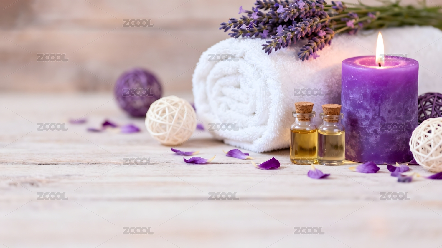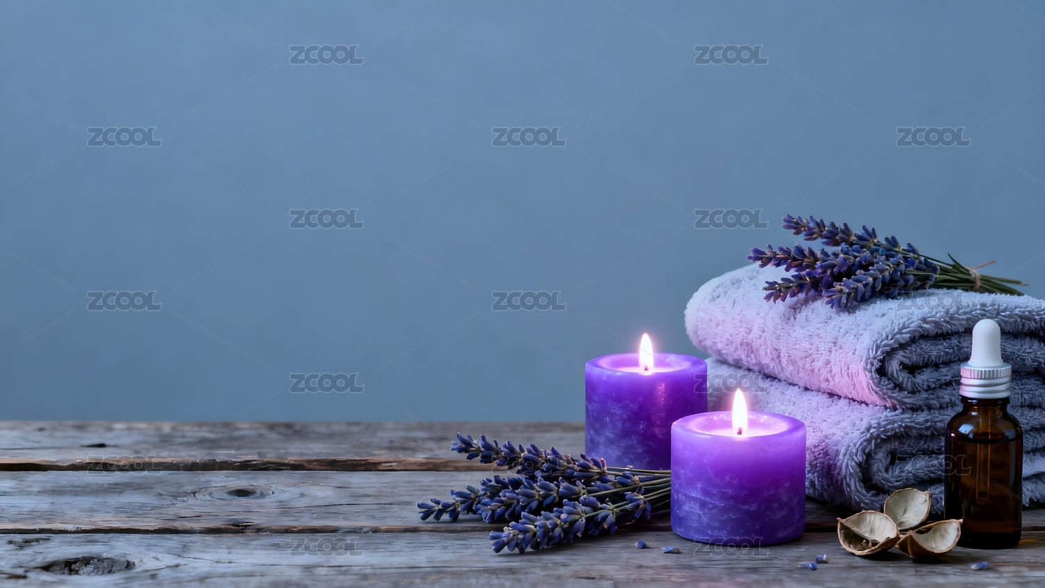 紫色香薰蜡烛搭配毛巾与薰衣草