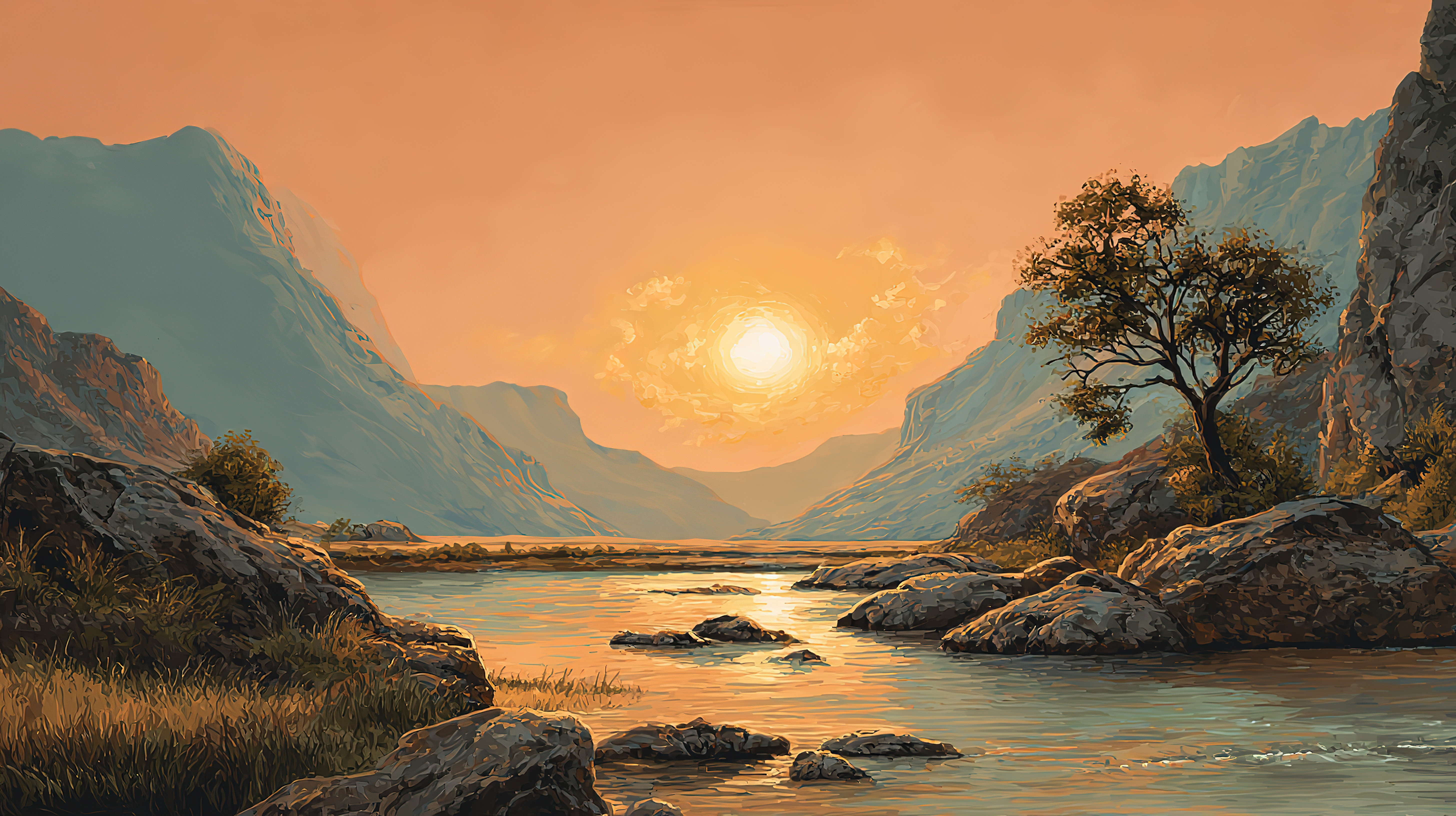 山谷日落静谧河流与孤树