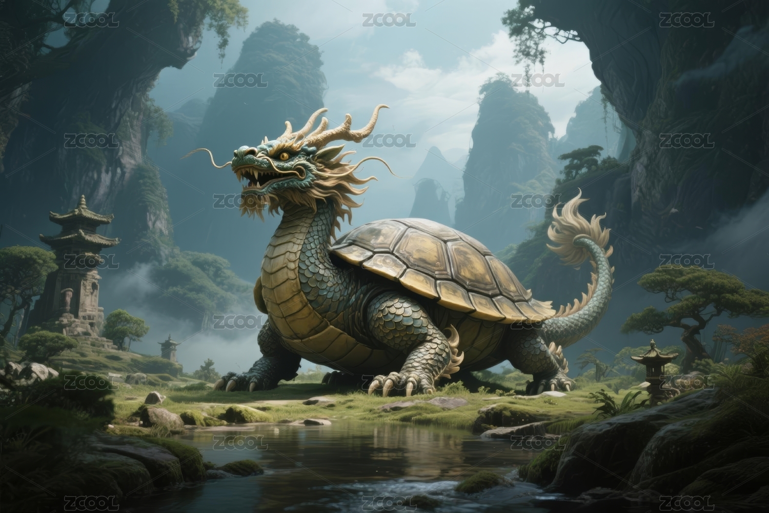 龙龟神兽奇幻感神话场景