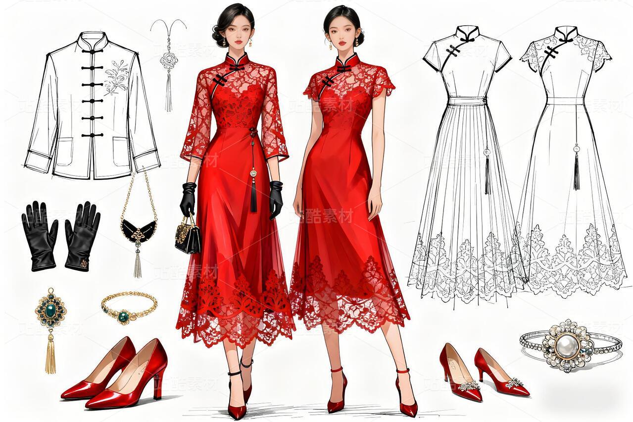 本系列以"赤锦映月"为主题,将传统中国红与现代蕾丝工艺完美融合。女裙采用正红苏绣缎面为底,覆盖黑色蕾丝镂空层,形成红黑交织的视觉韵律。立领处饰以珍珠盘扣,胸前运用蕾丝剪花工艺呈现牡丹纹样。宽袖设计融入汉服元素,袖口蕾丝呈云纹轮廓。男装设计突破性地将蕾丝应用于西装内衬与衣领细节,与女装保持美学连贯性。裙摆采用三层蕾丝叠加工艺,行走间透出若隐若现的红色底缎。配套的蕾丝长手套与红底黑面高跟鞋,延续整体设计的华丽质感,展现中西合璧的轻奢美学。