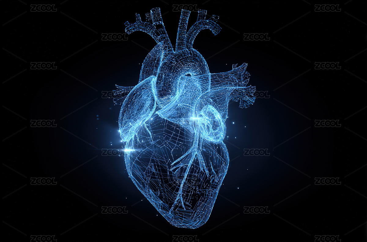 科幻机械人造心脏的黑底彩色渐变透视插画