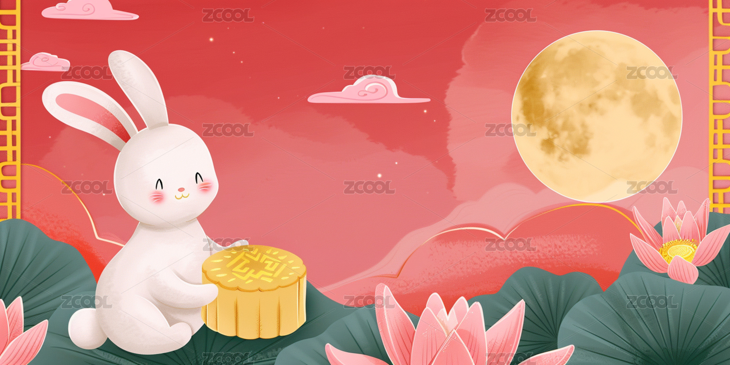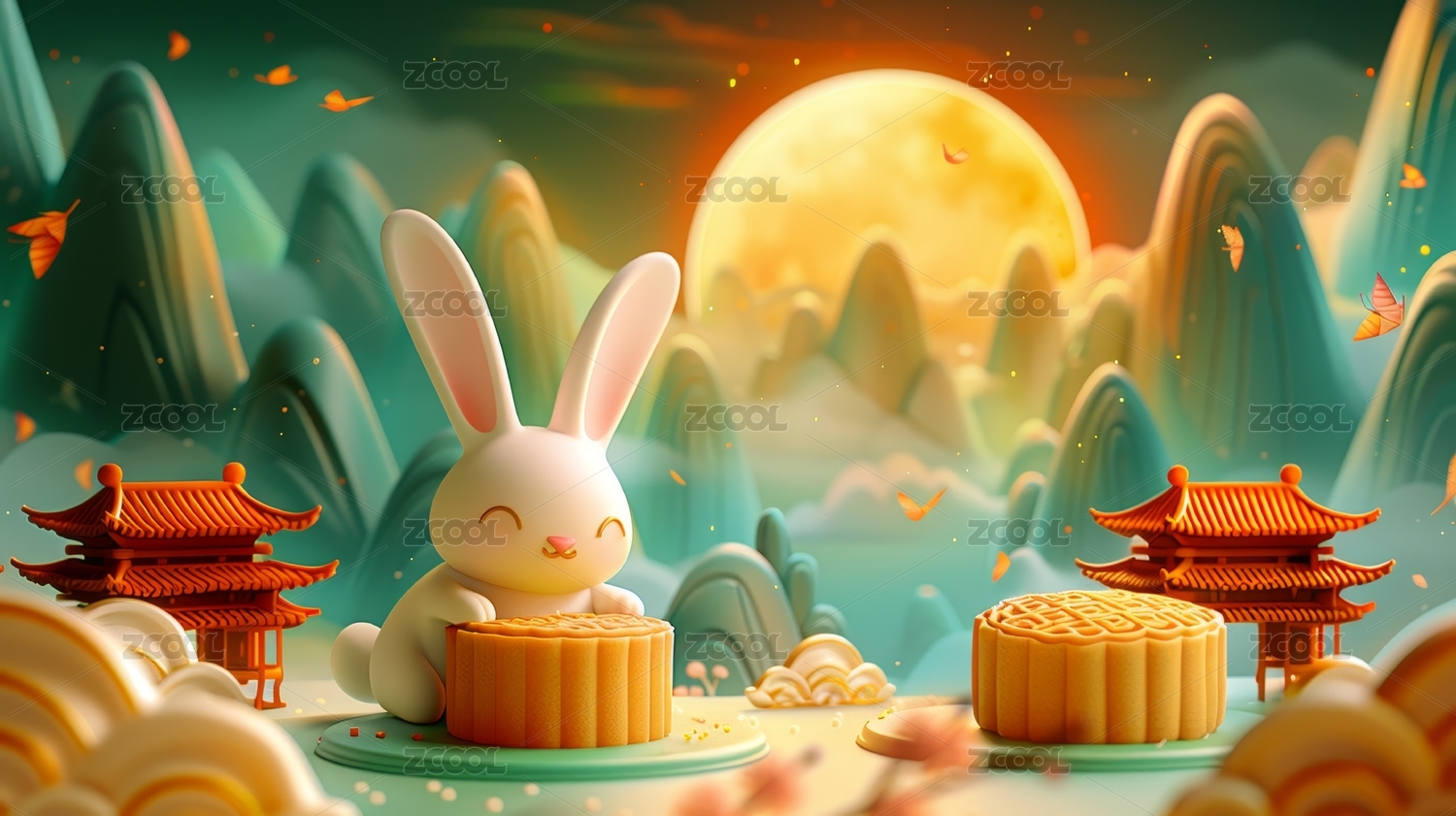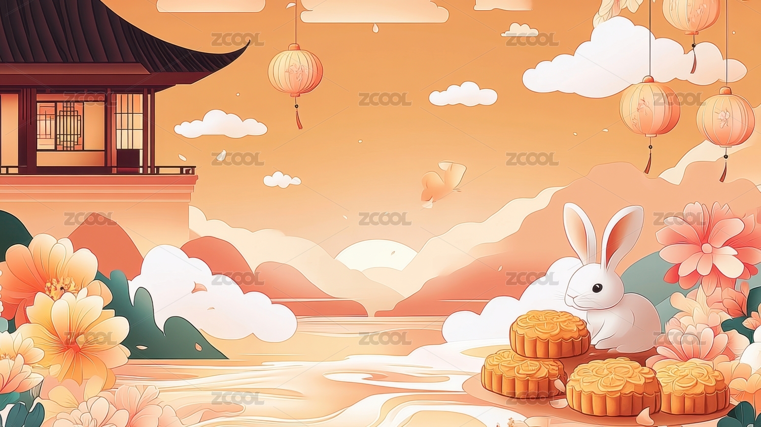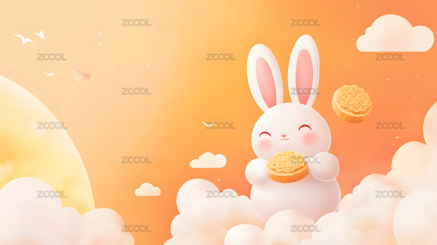 中秋节卡通云上的可爱小兔子拿着月饼插画