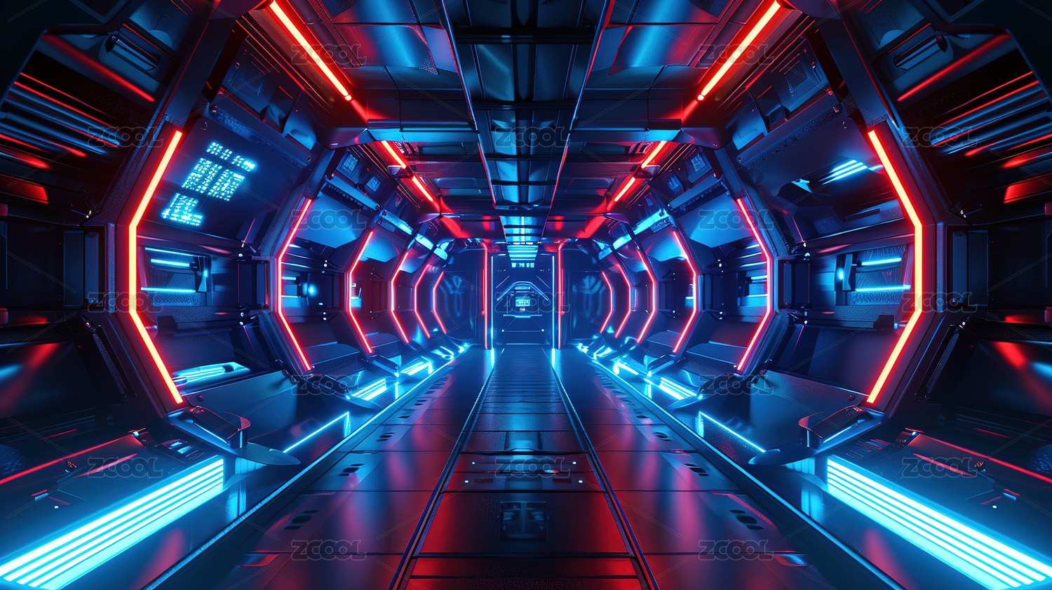 3D渲染科幻几何隧道霓虹灯线概念插图