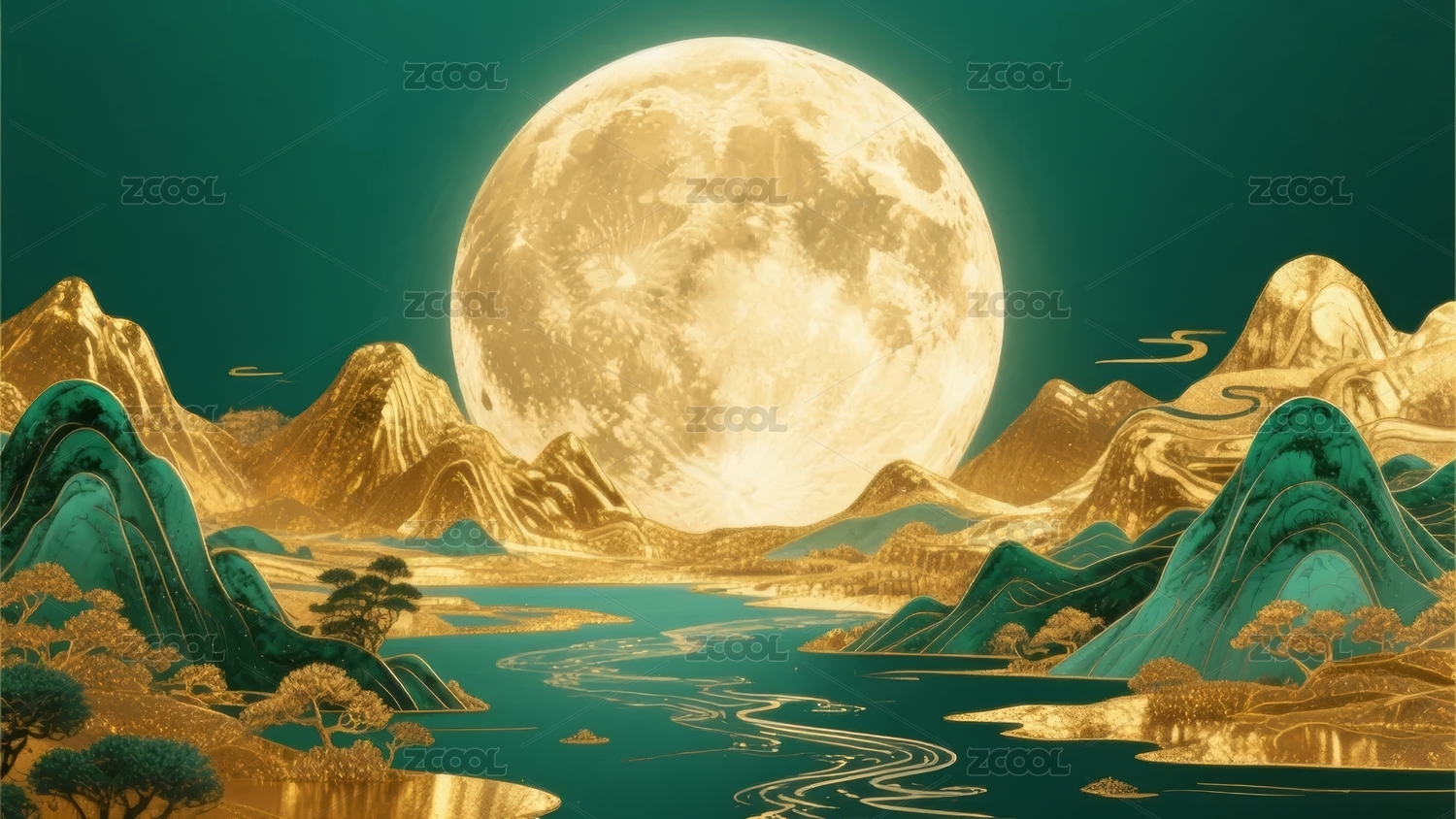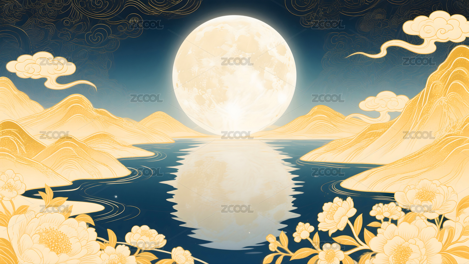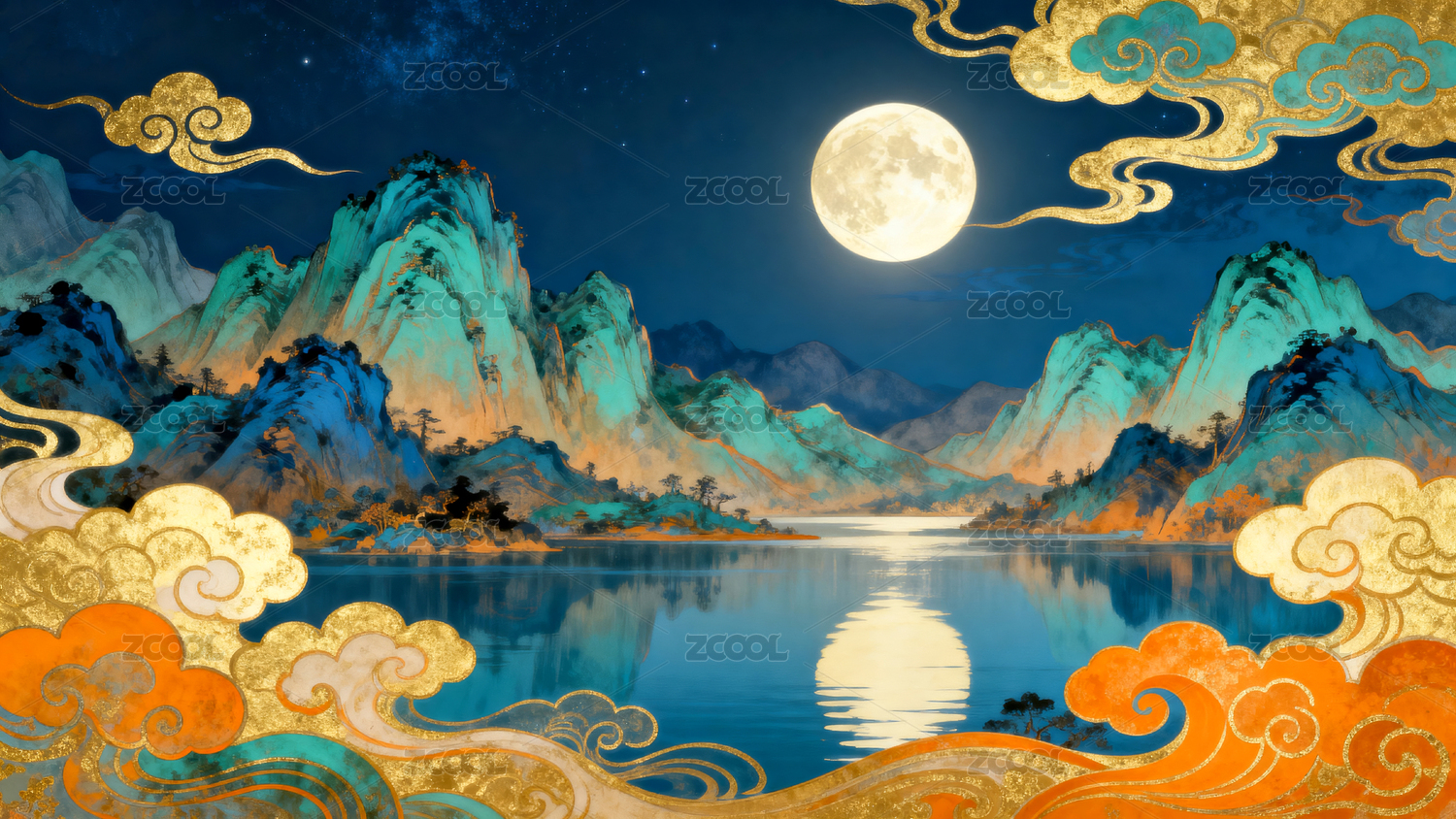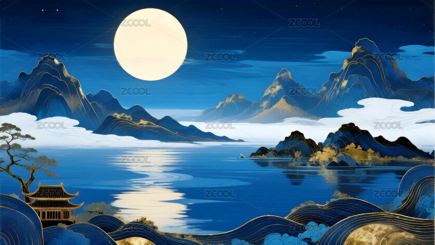 月亮,山水,水墨画,中国风,国风,湖面,夜景,云雾,山峰,倒影