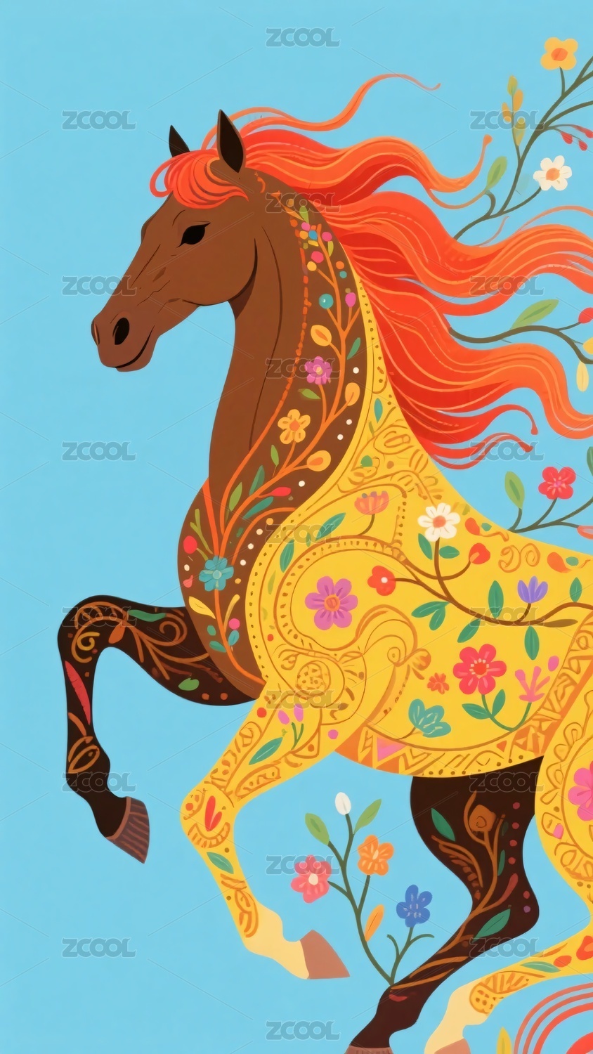 奔跑的花纹装饰骏马插画