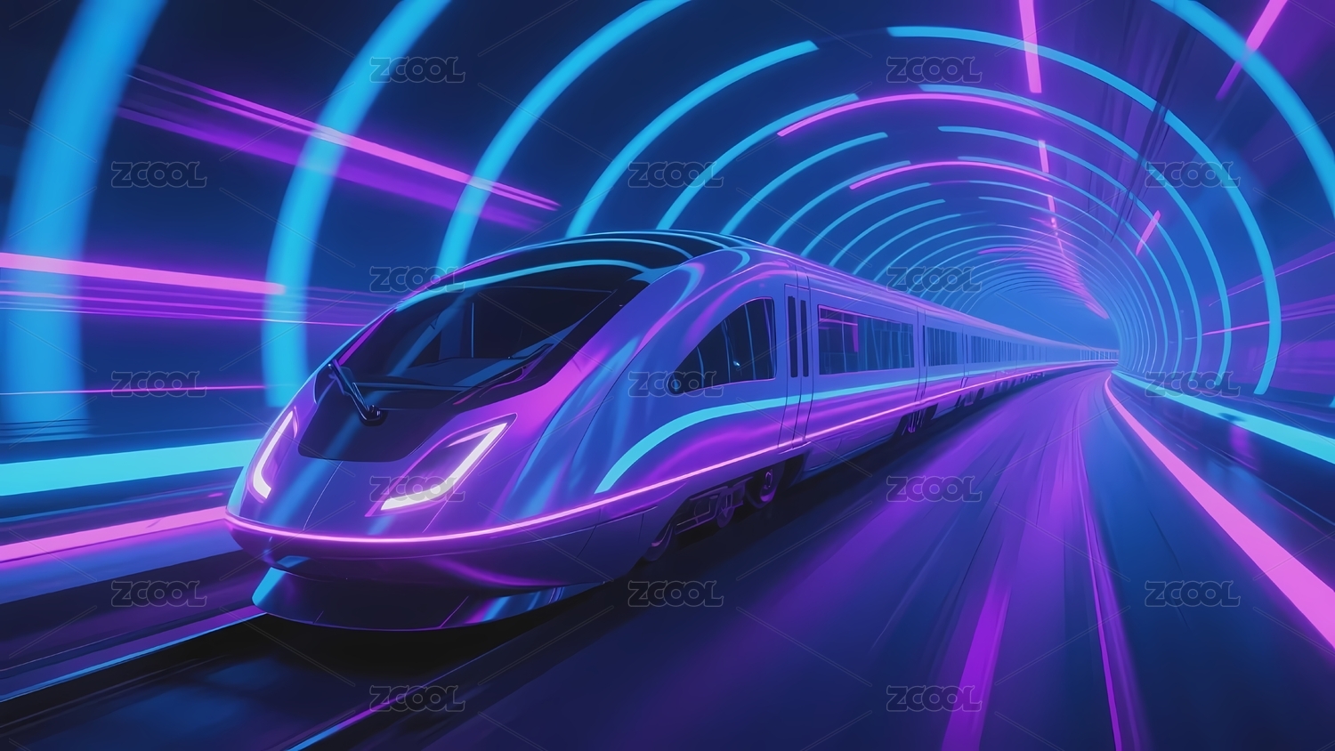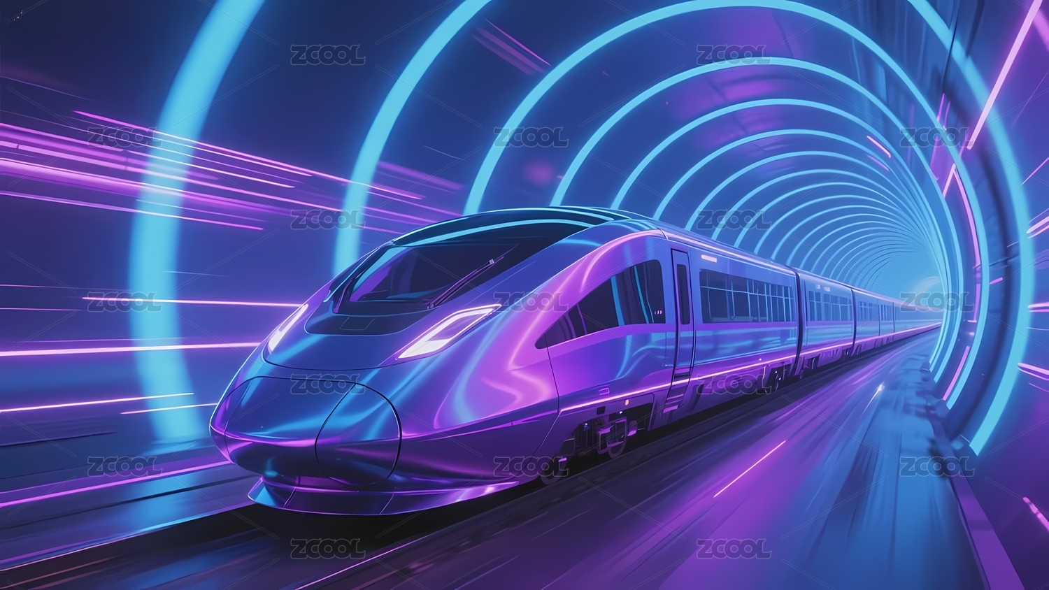 高速列车,未来科技,蓝色光线,光影效果,虚拟现实,霓虹隧道,疾驰,轨道,交通,科幻