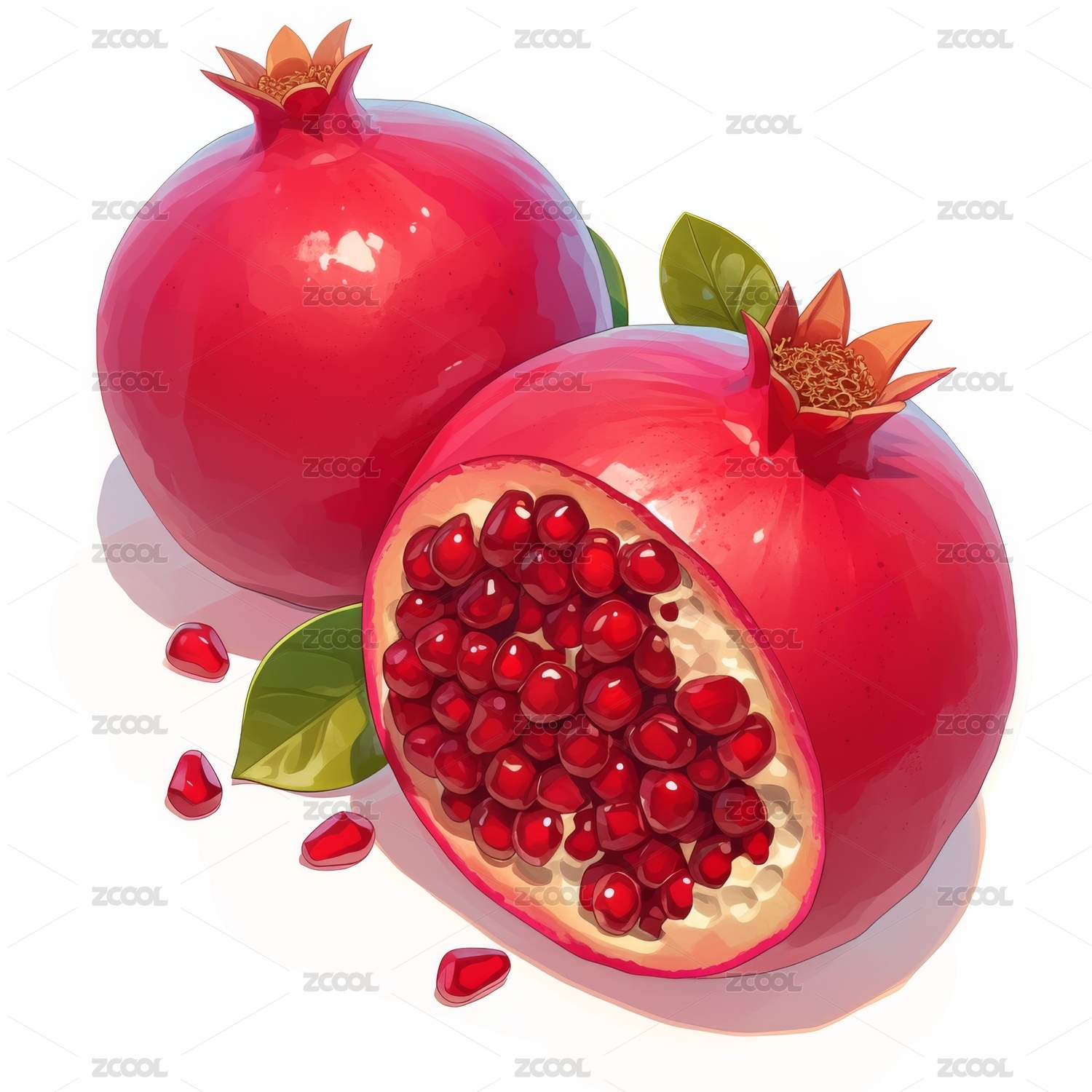 白底石榴整颗与切开石榴籽散落籽