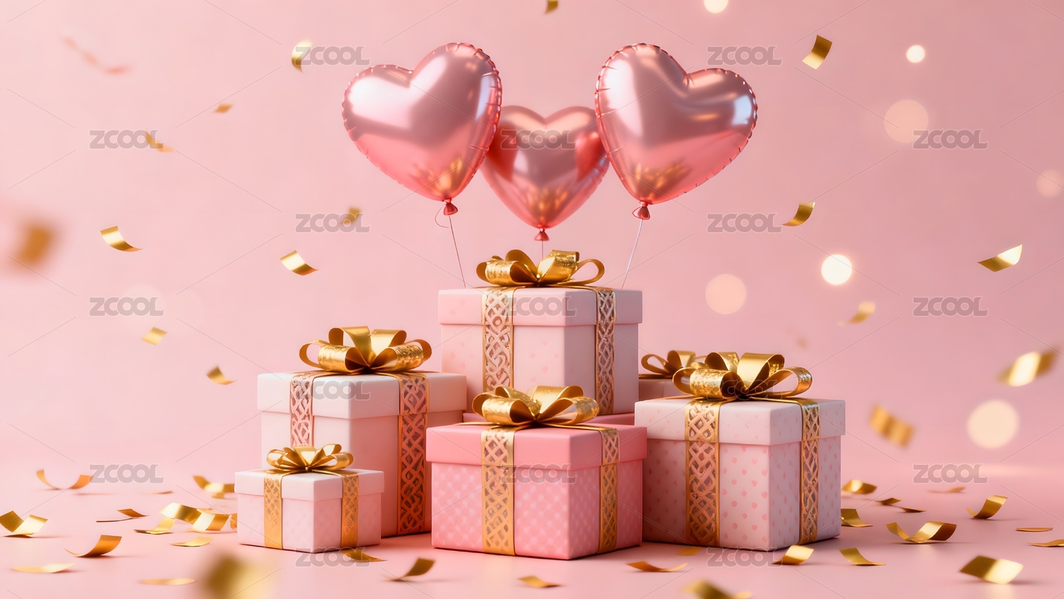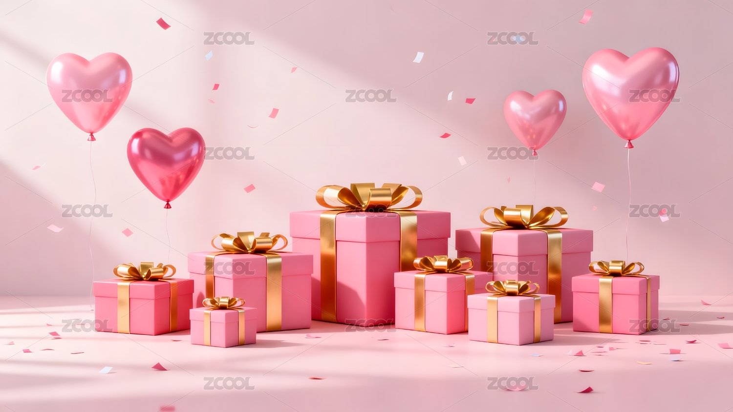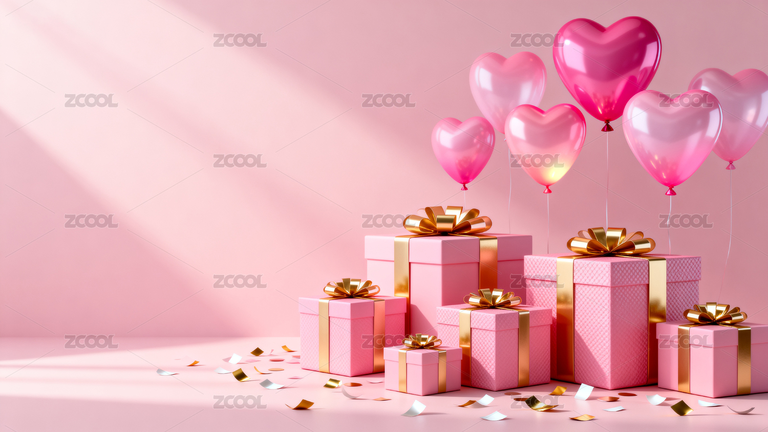 粉色礼物与爱心气球的庆祝场景