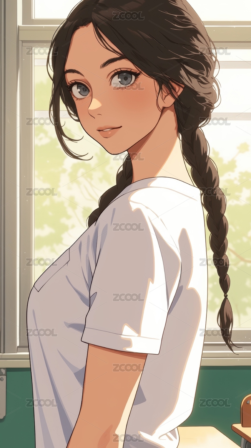 窗边的双辫女孩
