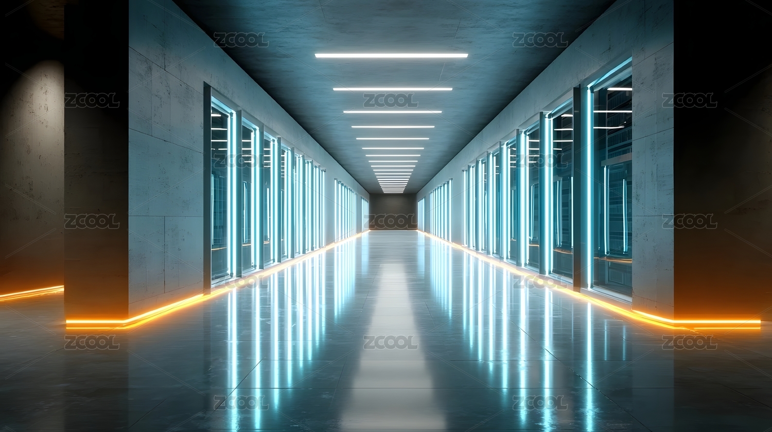 建筑,室内,设计,简约,现代,蓝色,走廊,灯光,地面,反射