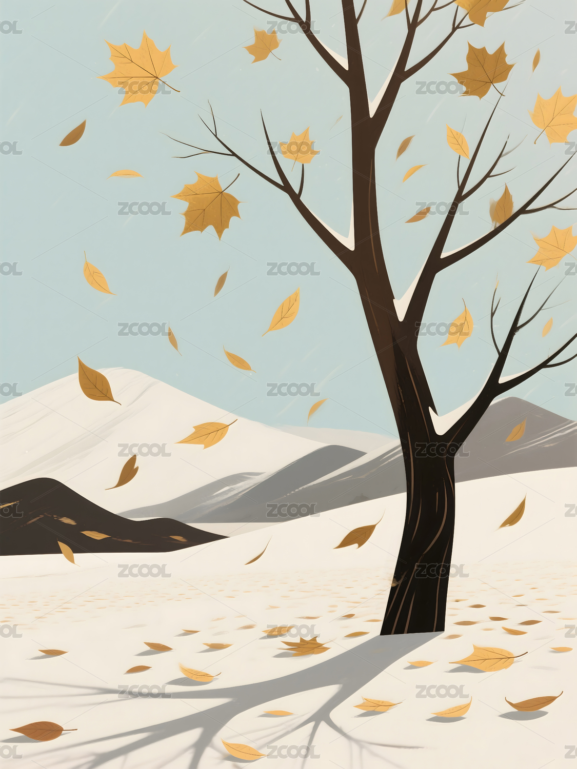 柿子,银杏,冬季,雪景,水墨画,国画,寒冬,落叶,柿子树,飞鸟