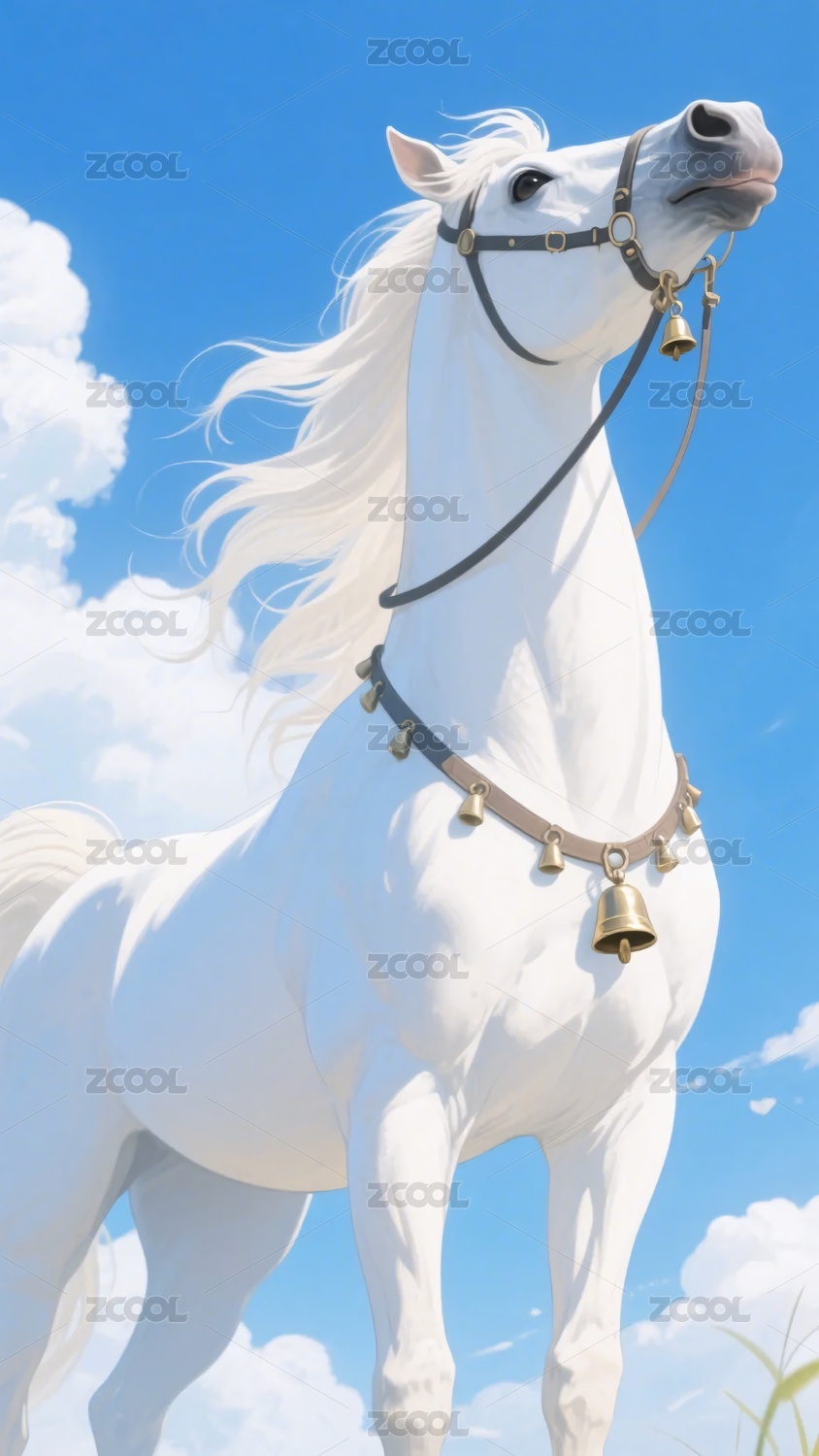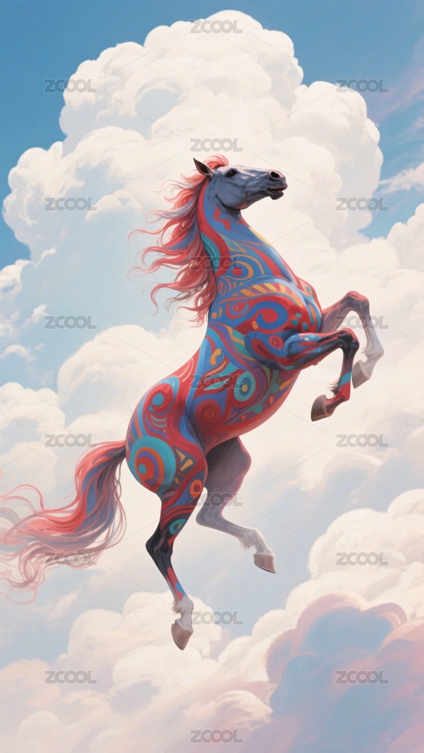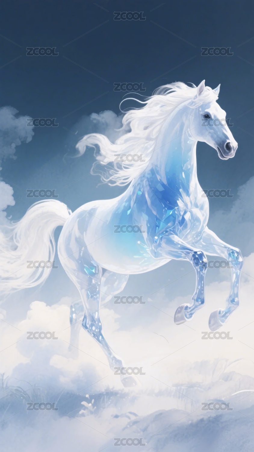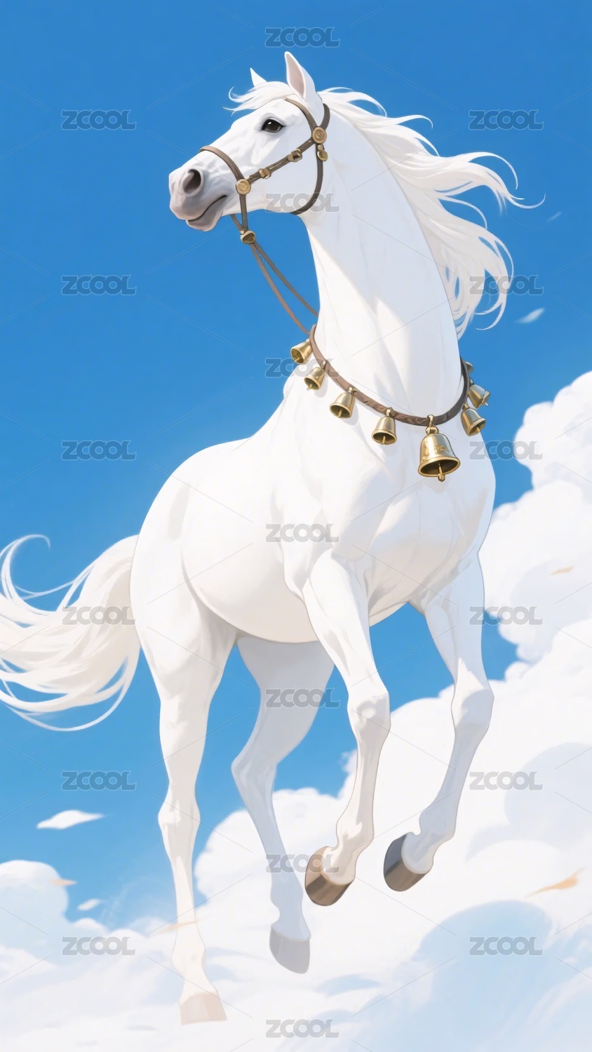 白马,云朵,天空,跃起,奔跑,插画,动物,幻想,飘逸,鬃毛