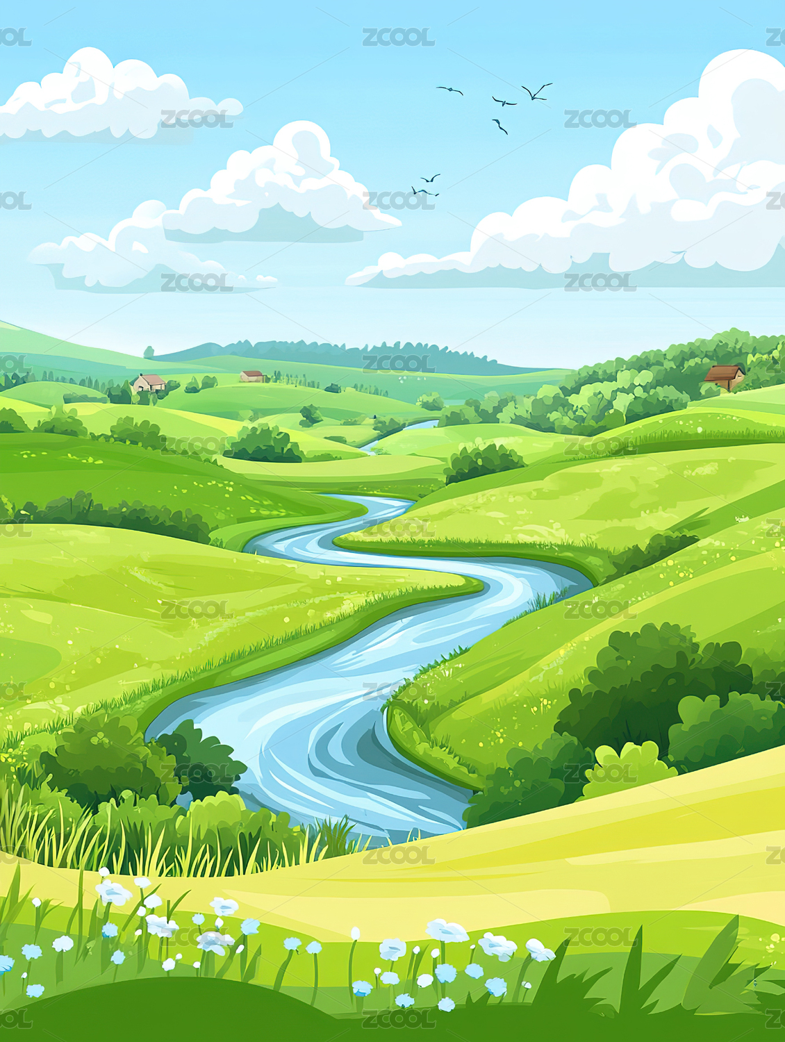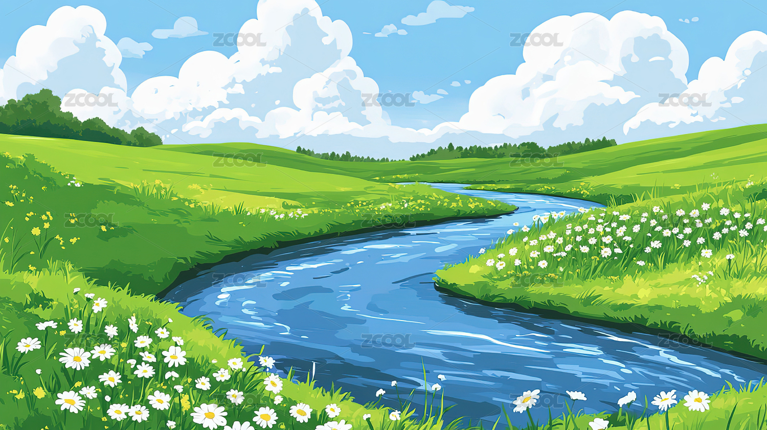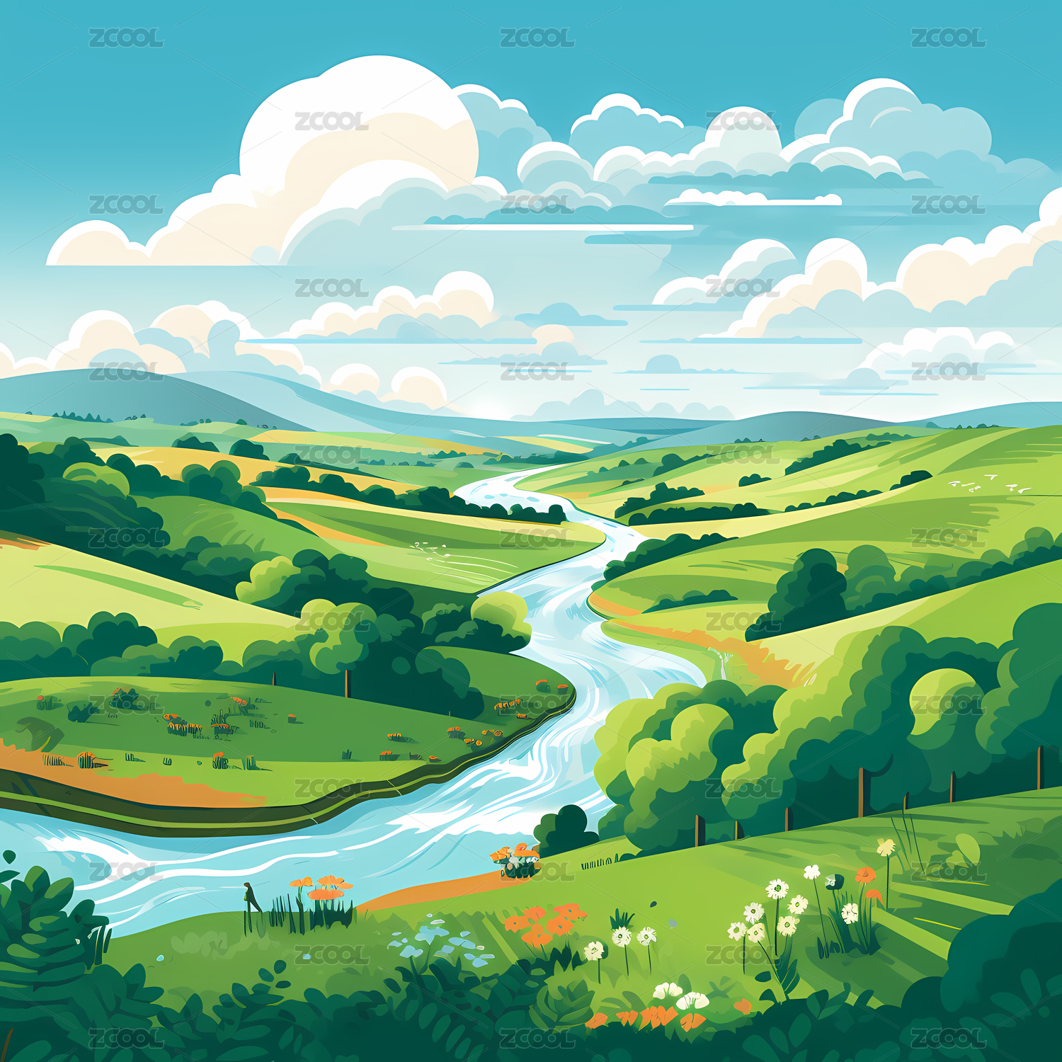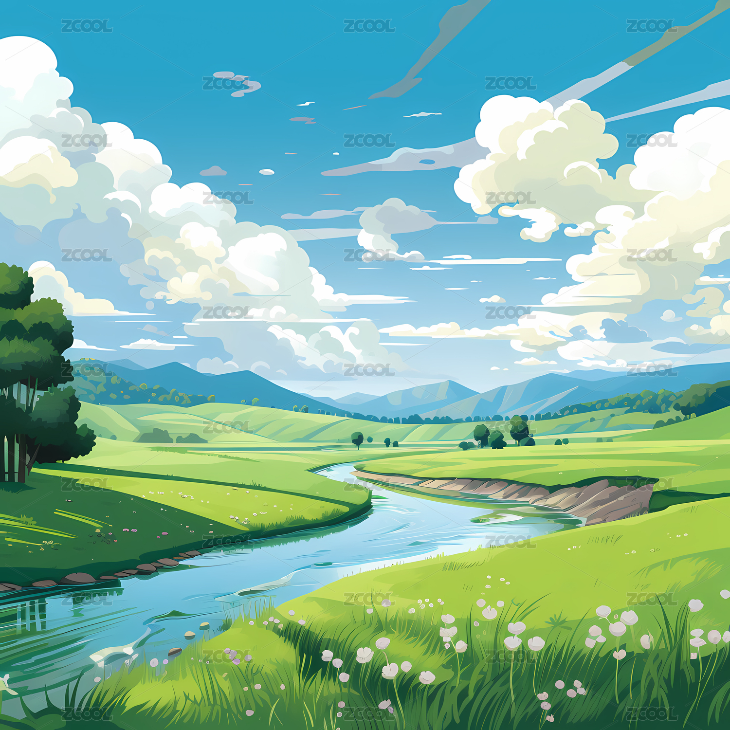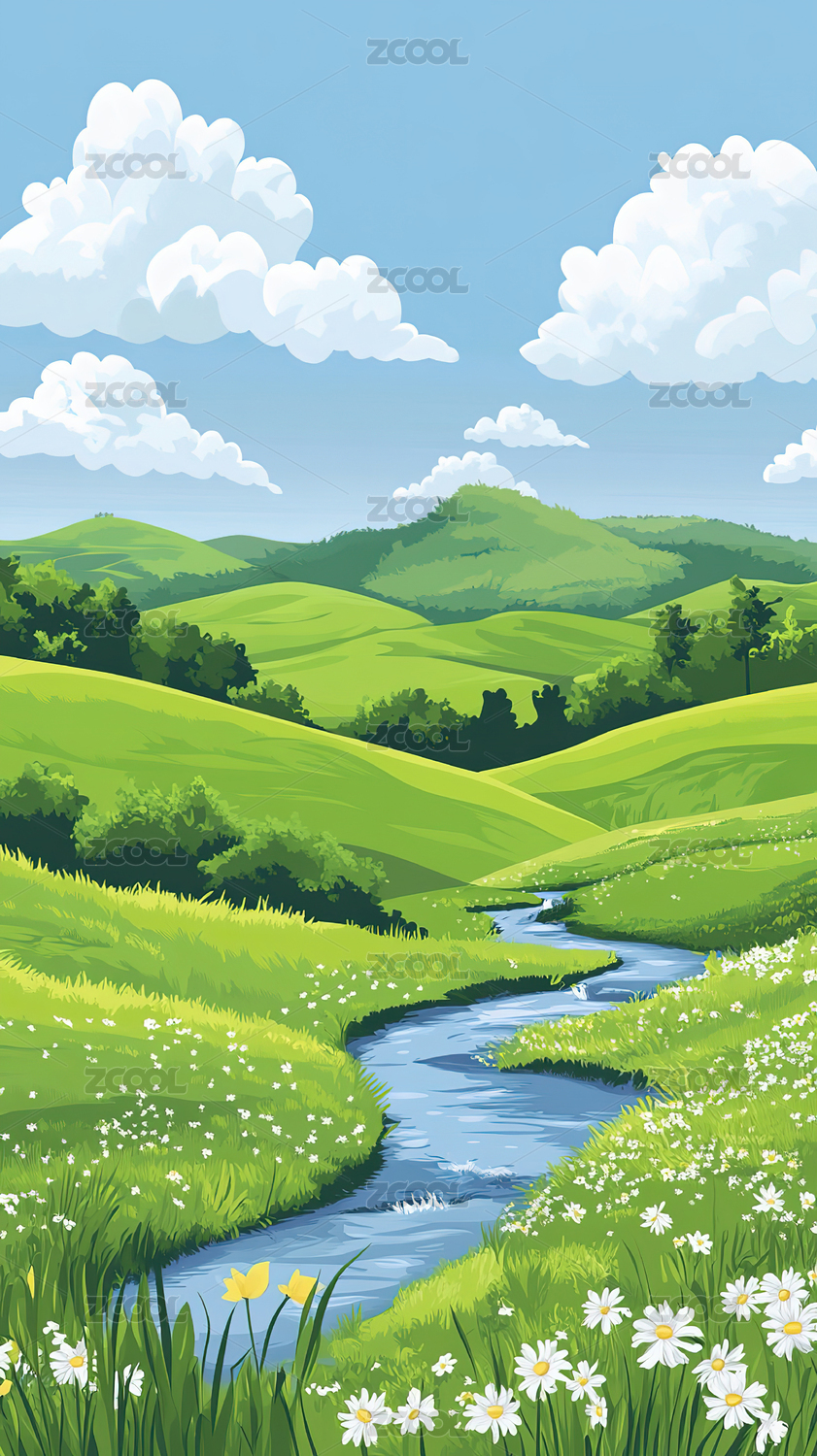 户外河流草地高山天空风景插画
