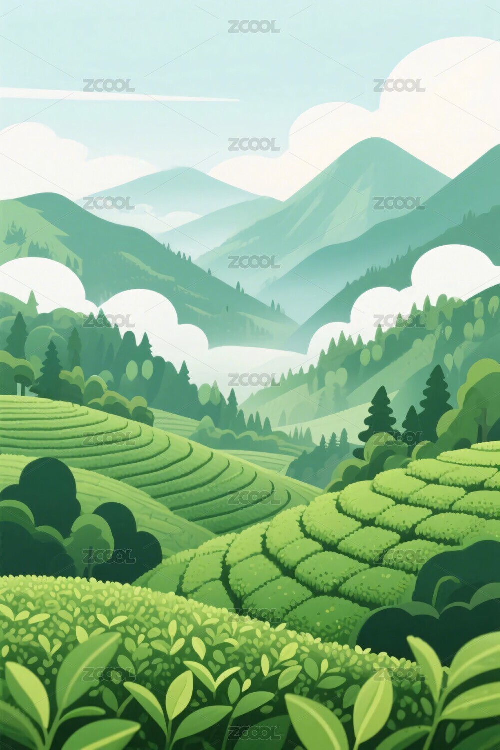 茶园,梯田,山脉,太阳,植物,绿叶,风景,自然,田园,插画