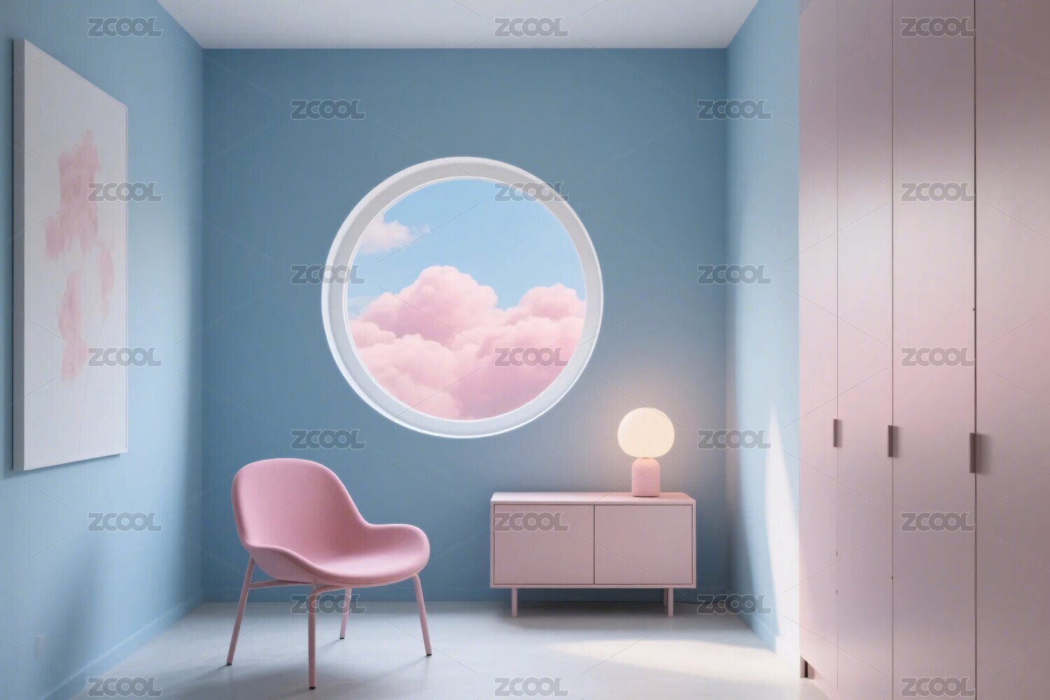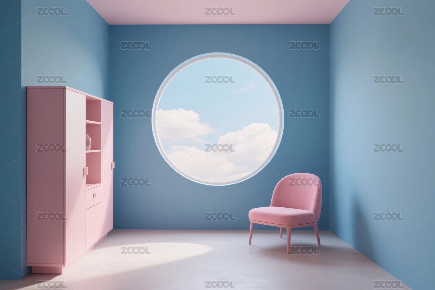 圆形窗户,云朵,蓝色墙面,粉色椅子,浅色橱柜,室内,简约,插画,装饰,空间