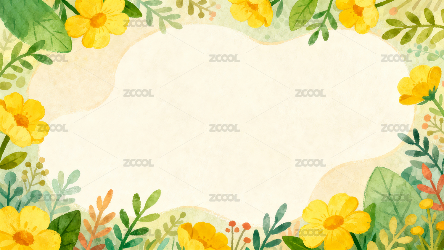 黄色花朵与绿叶环绕的空白云朵背景