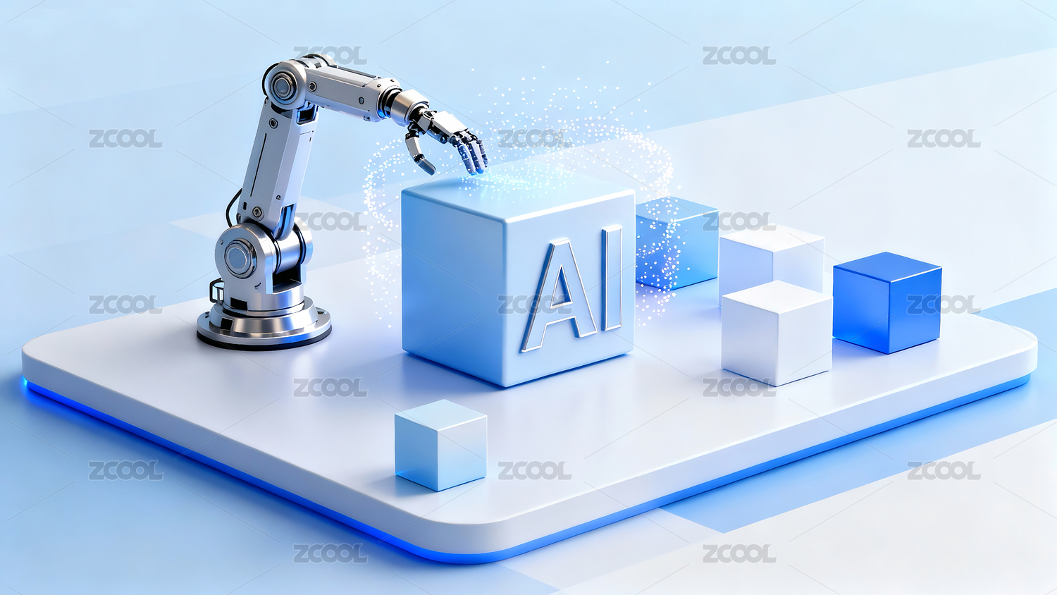 机械臂抓取发光立方体的科幻场景