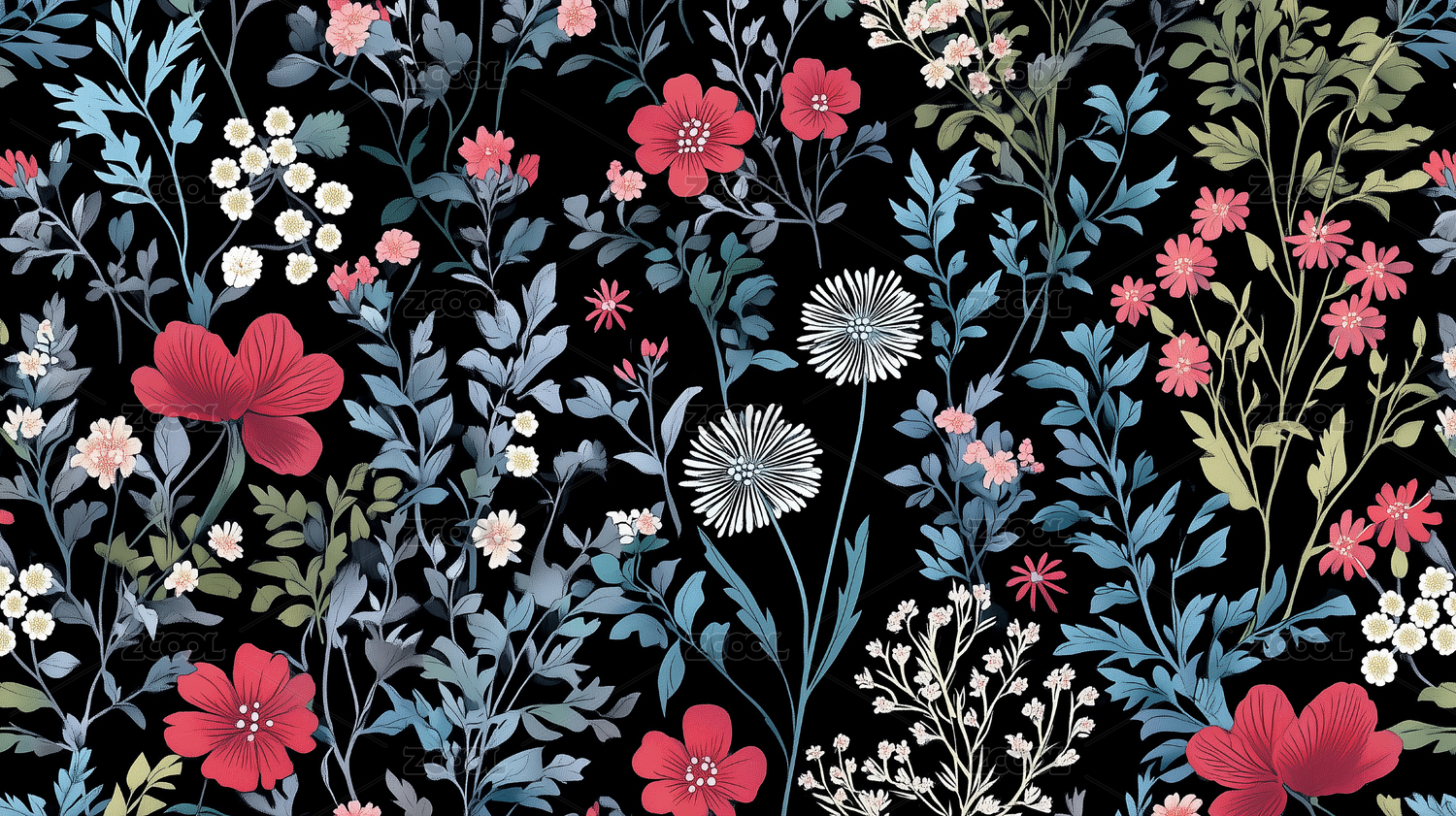 黑色背景蓝绿花卉图案