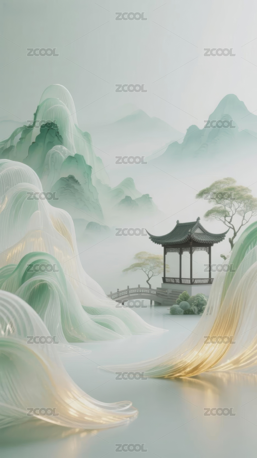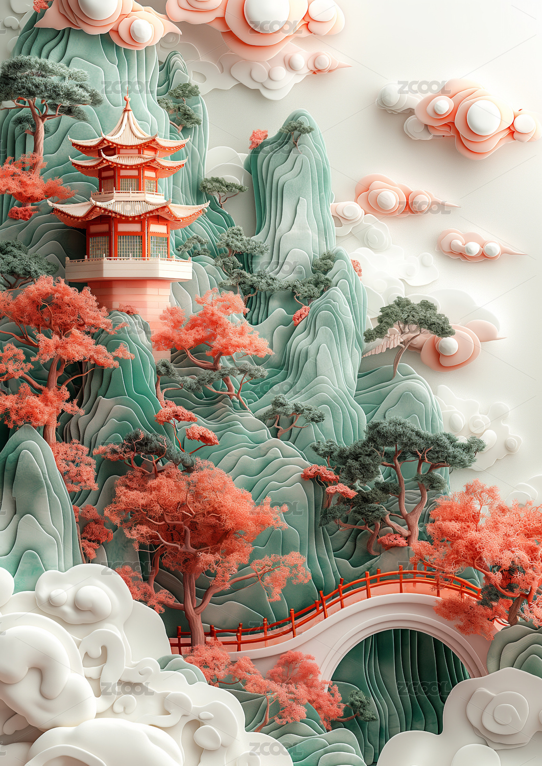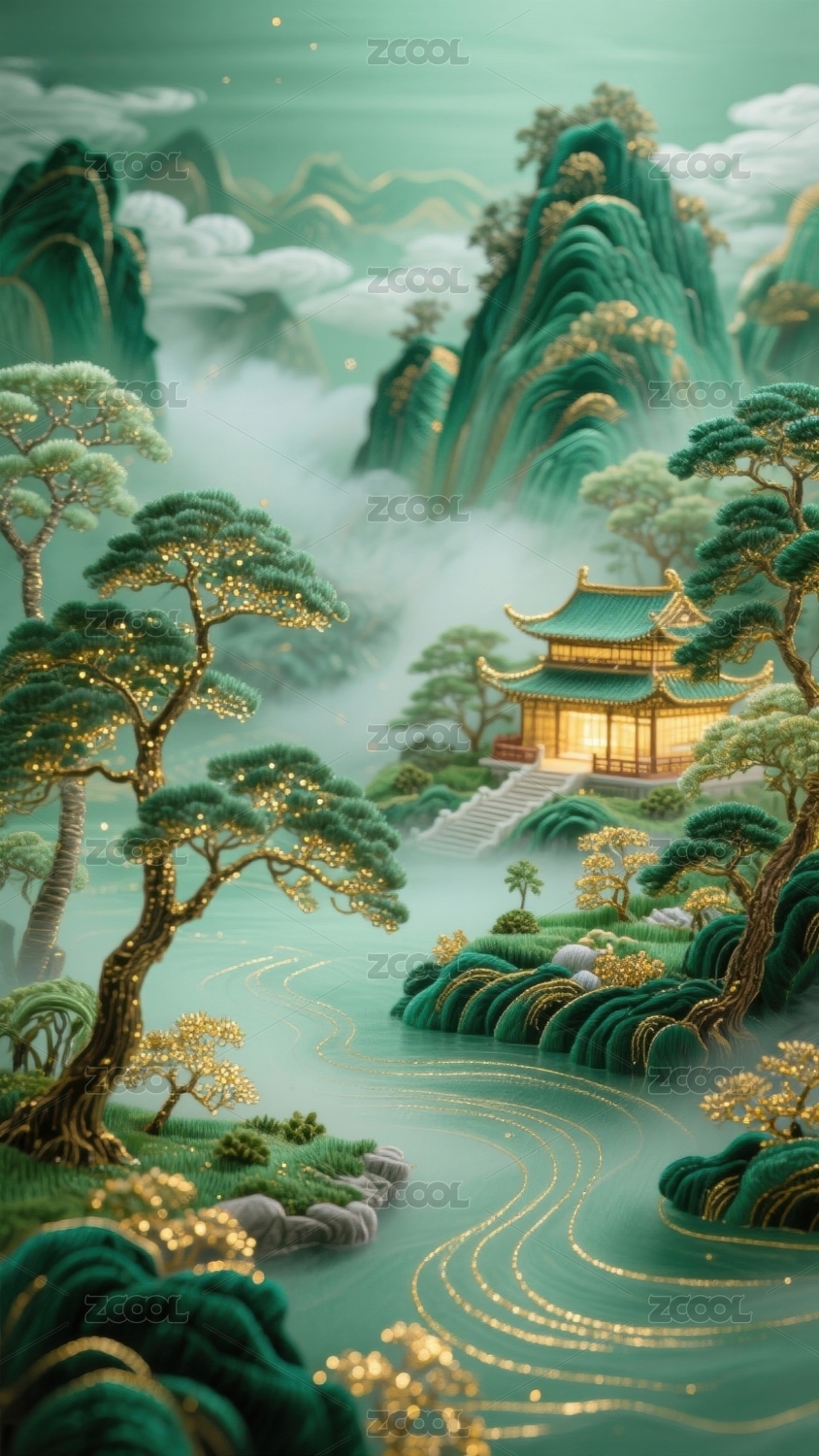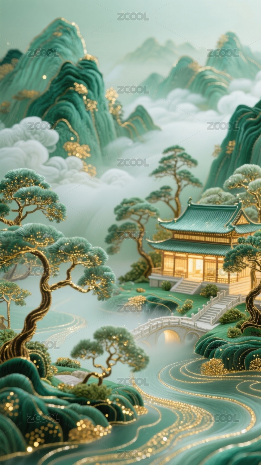 艺术, 东方, 梦幻, 自然, 美丽, 绘画, 风景, 云雾, 建筑, 山峰