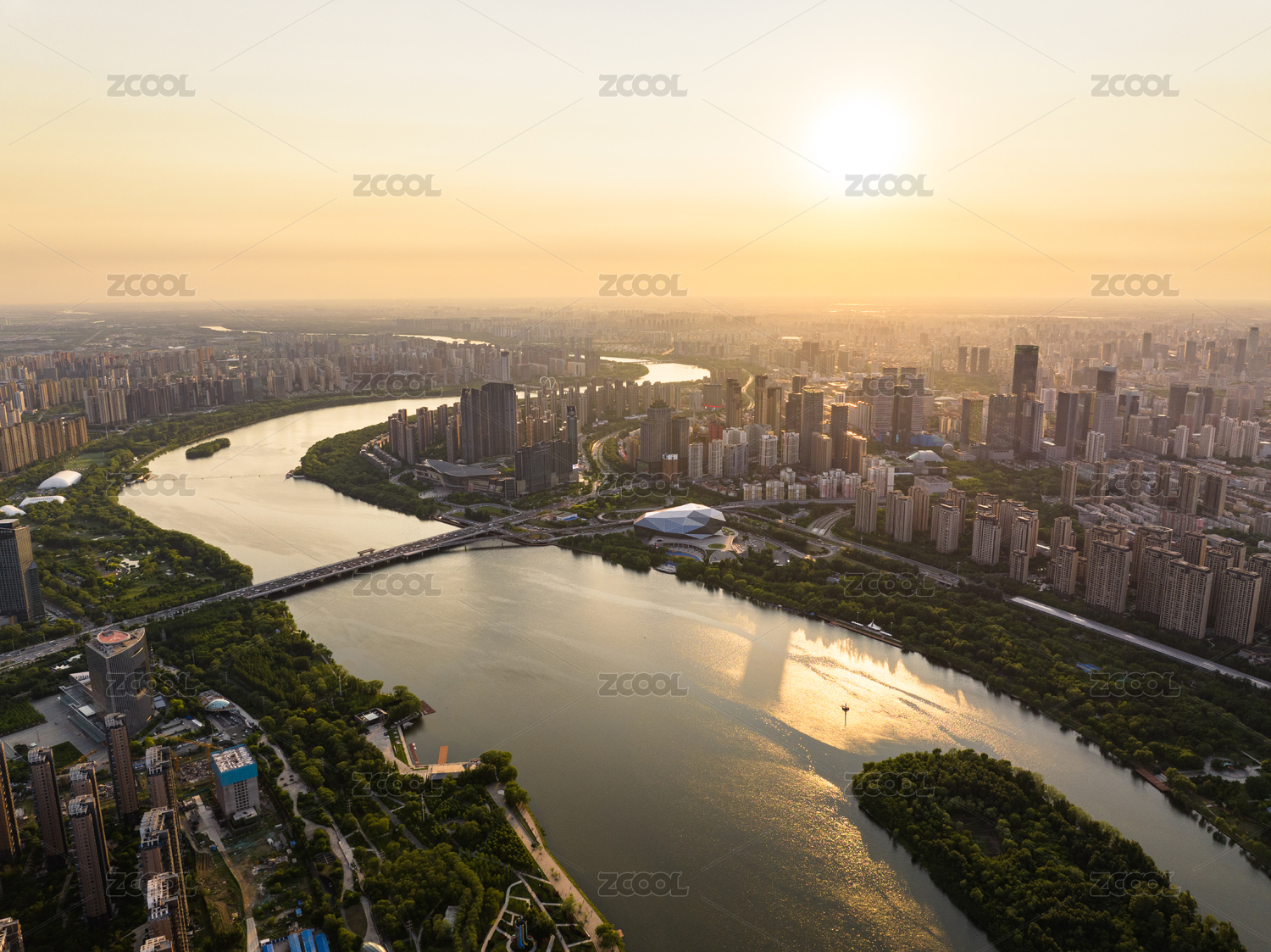航拍夕阳下中国辽宁沈阳浑河两岸都市风光