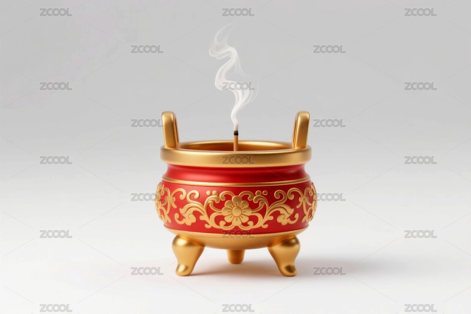 红色,金属,香炉,莲花,烟雾,传统,燃烧,金边,祥云,纹饰