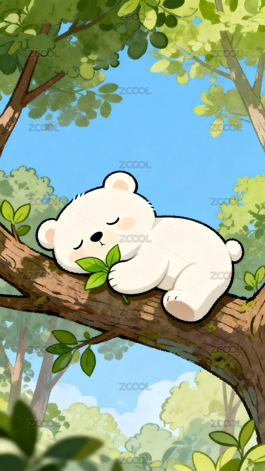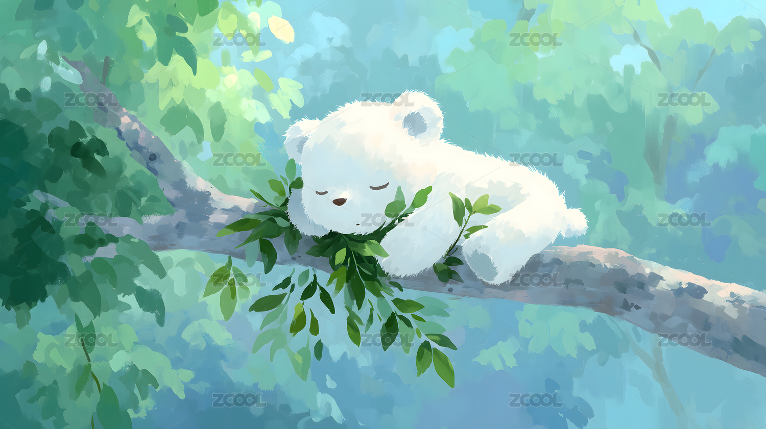 树枝,白色,天空,拥抱,小熊,睡觉,树上,绿叶,可爱,卡通