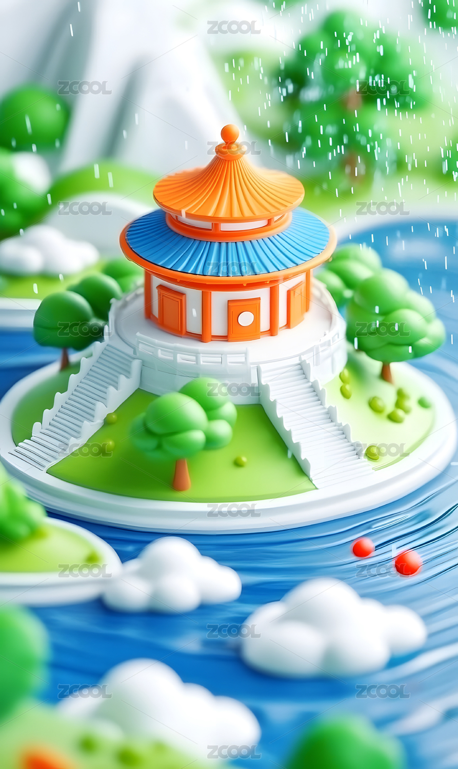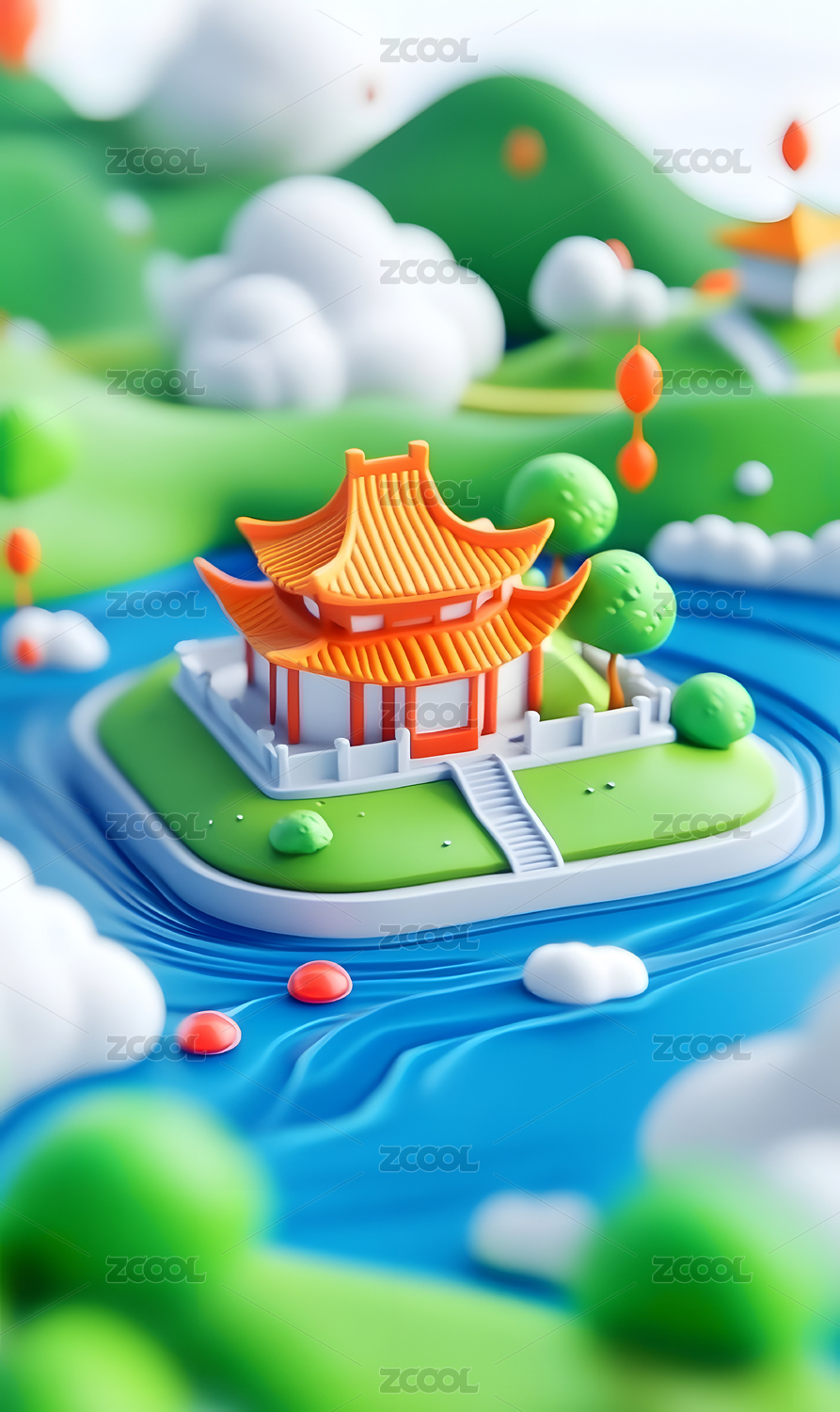 卡通,绿色,黄色,可爱,白色,天空,云朵,建筑,风景,明亮