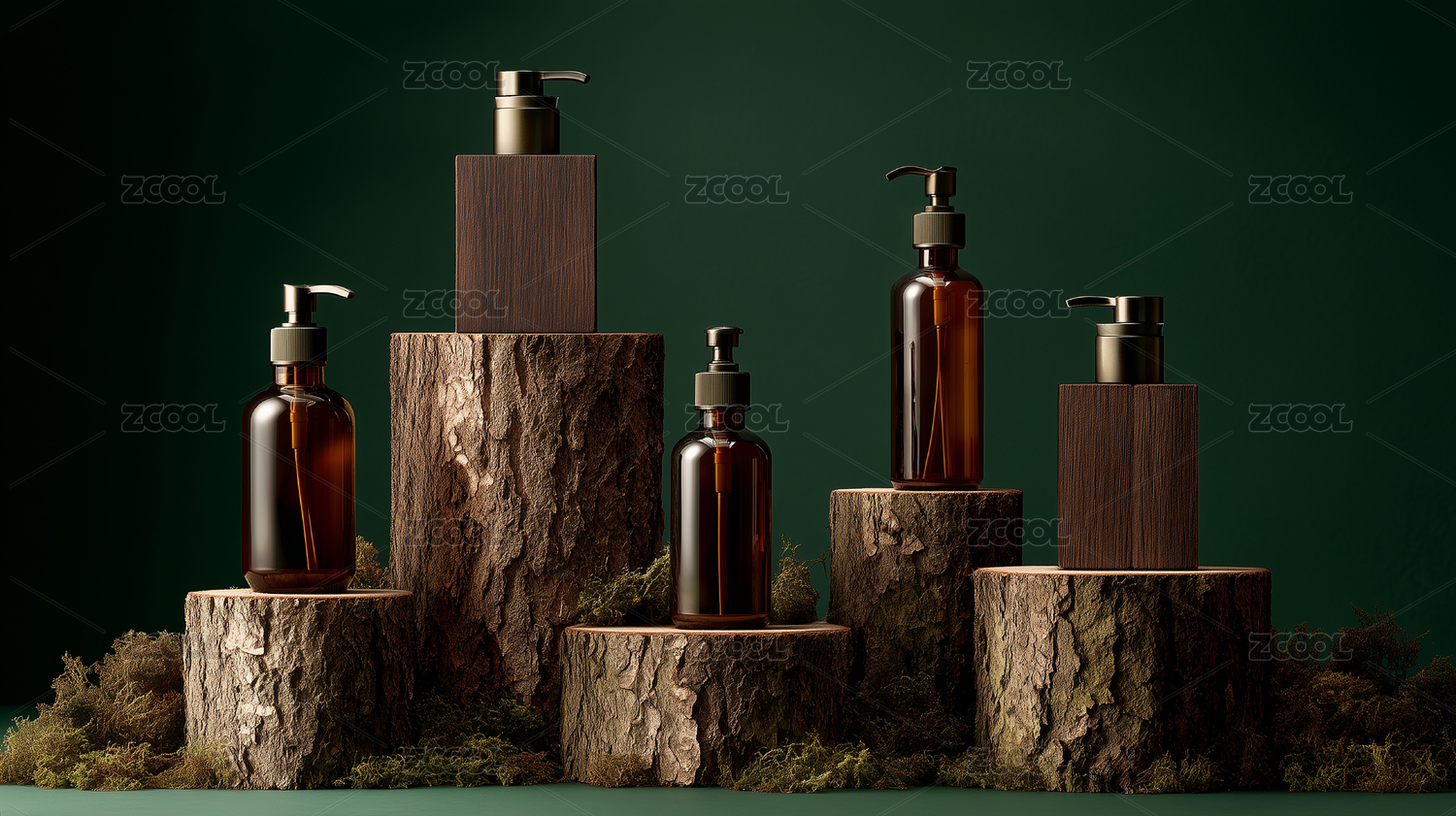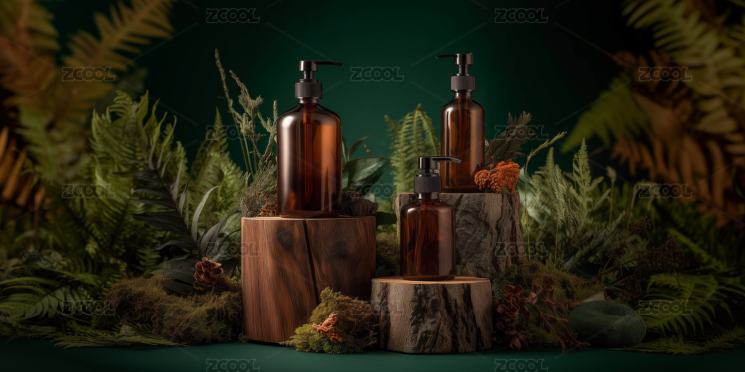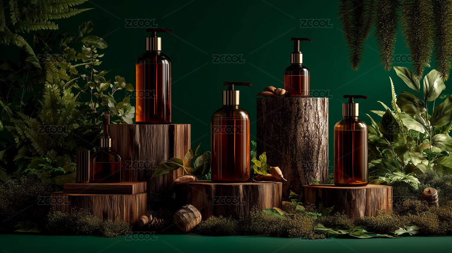 深色玻璃瓶置于绿色立方体上绿叶环绕