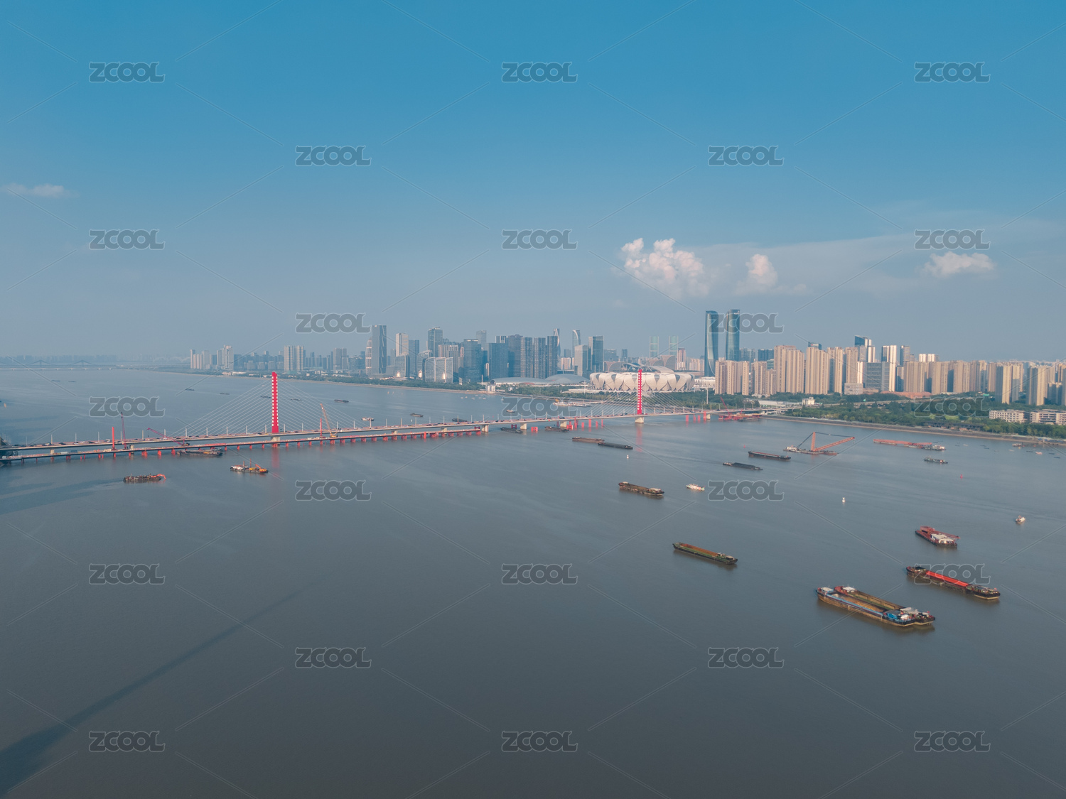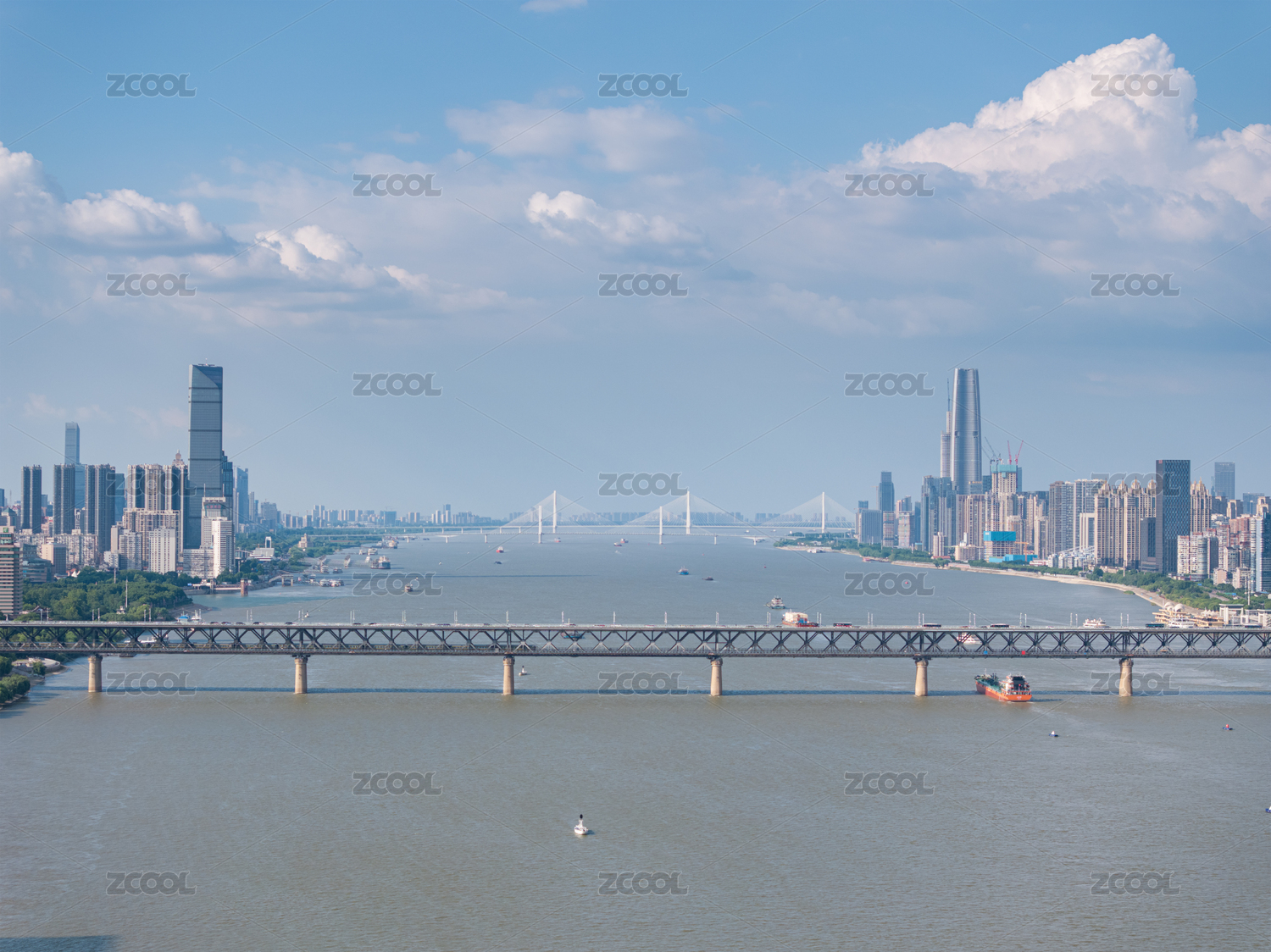 航拍夏季白天武汉长江上的桥梁和城市天际线