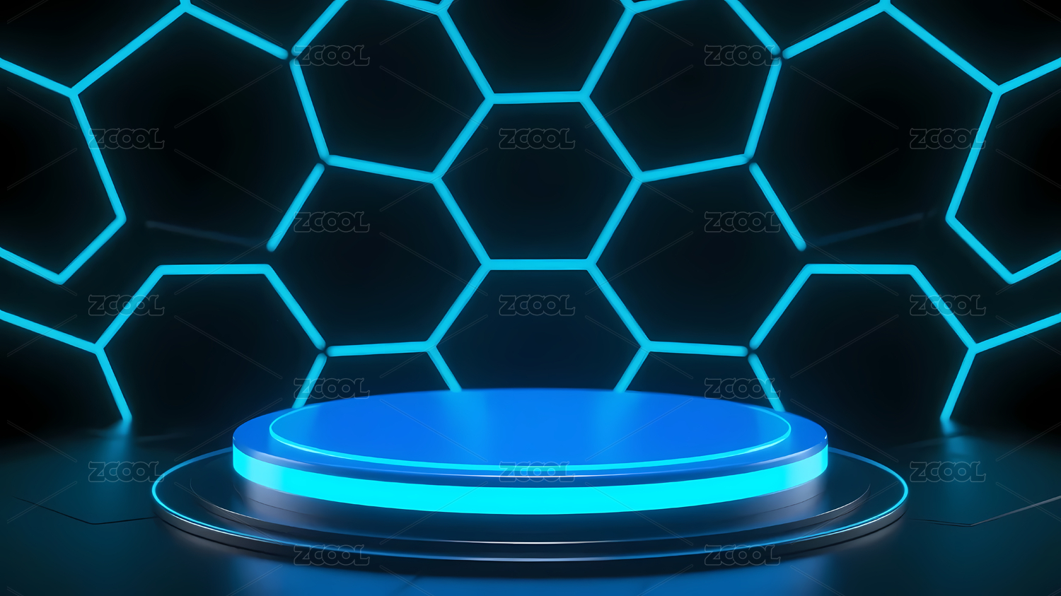 蓝色,科技,未来,深色,灯光,墙面,圆形,平台,霓虹灯,蜂窝