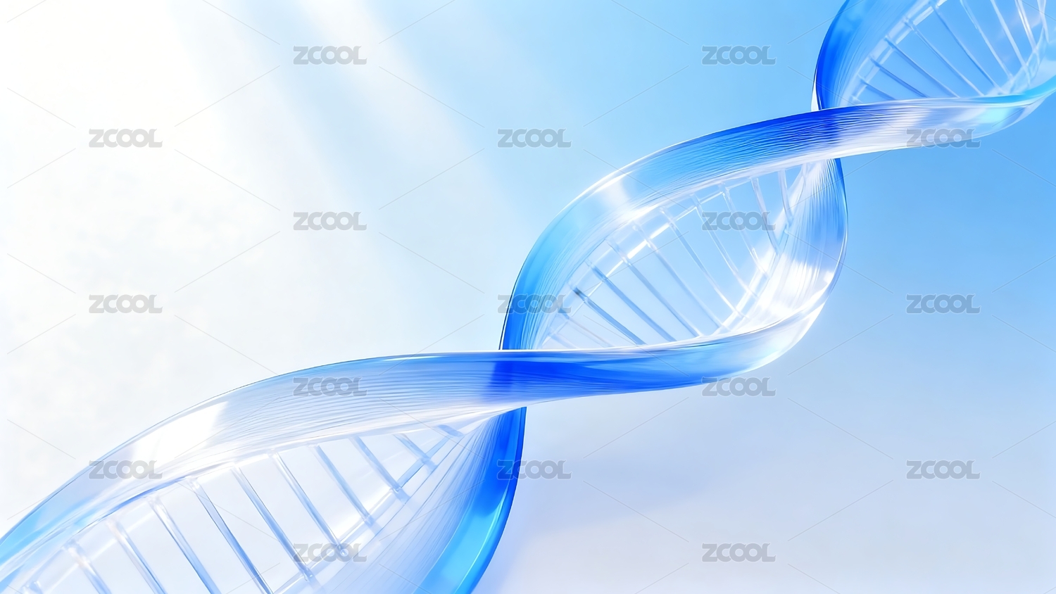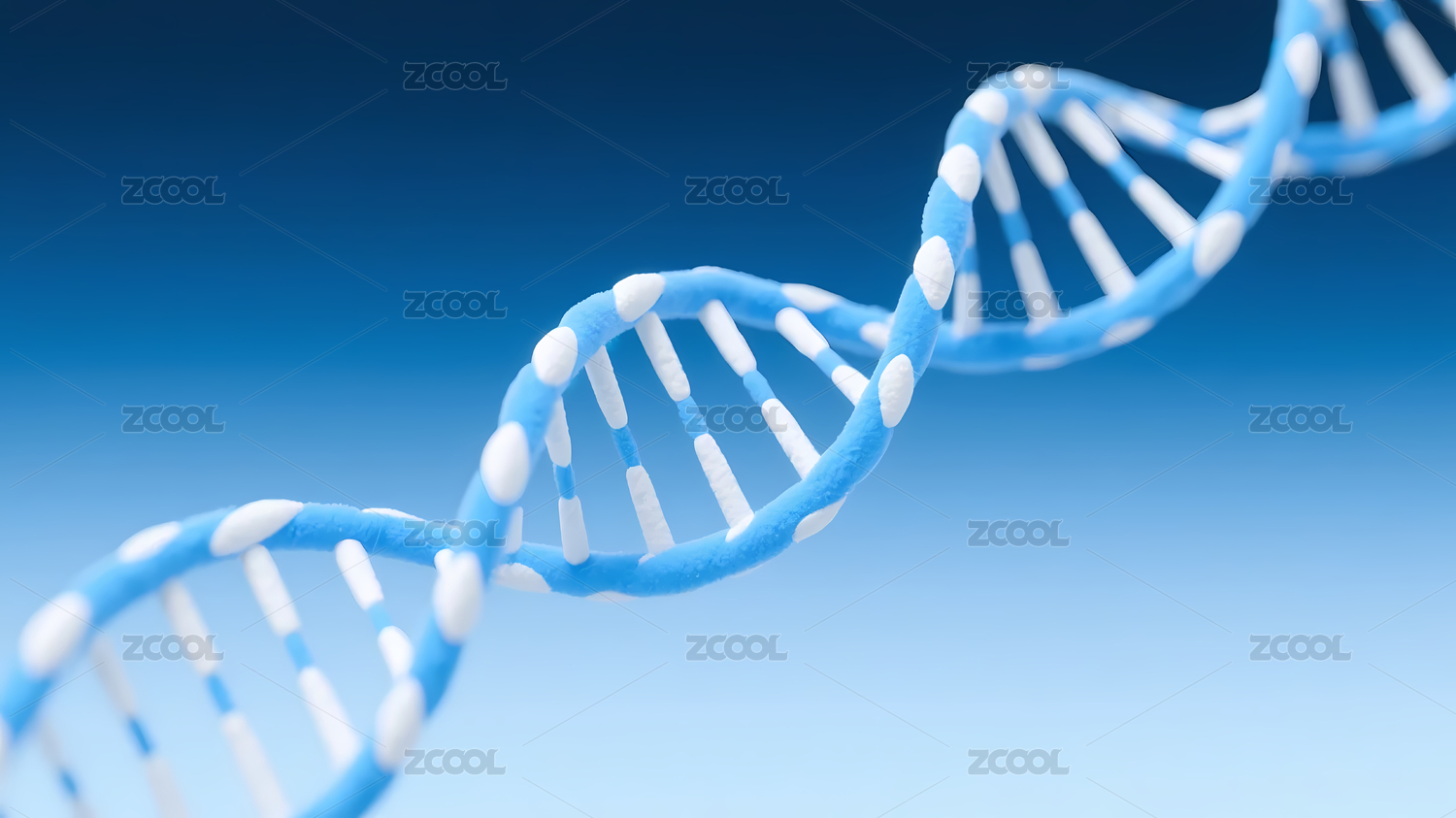 三维渲染的DNA螺旋双链模型在蓝色的液体背景中