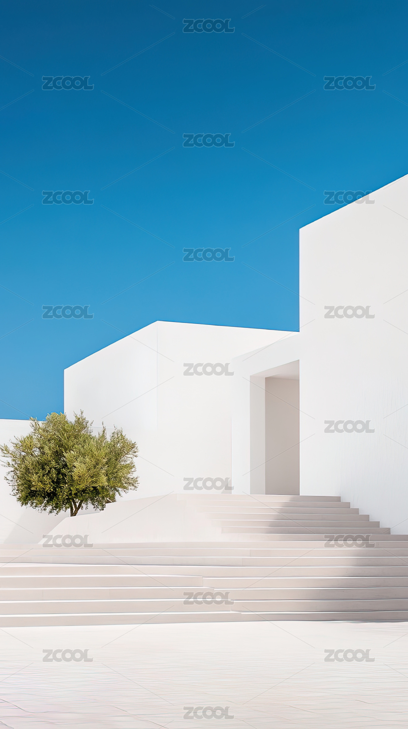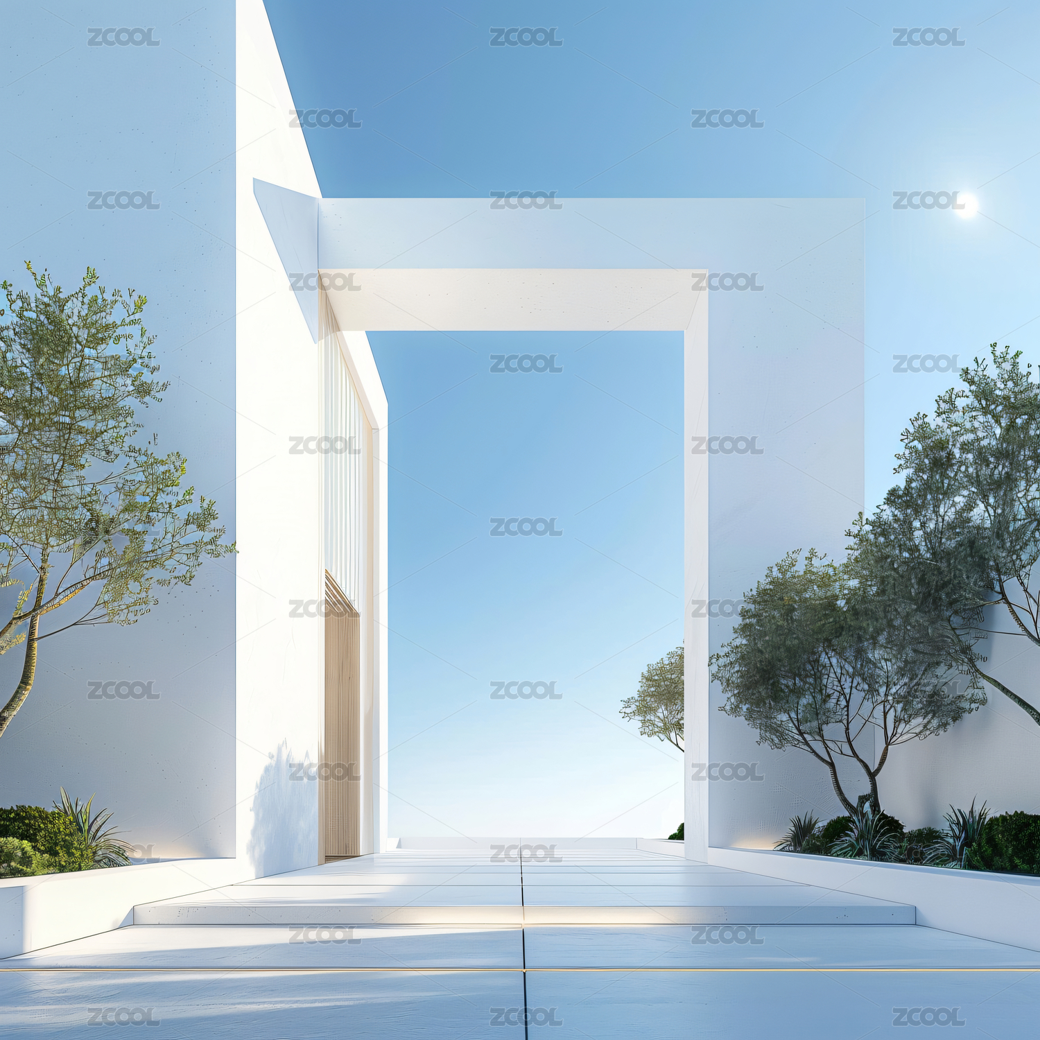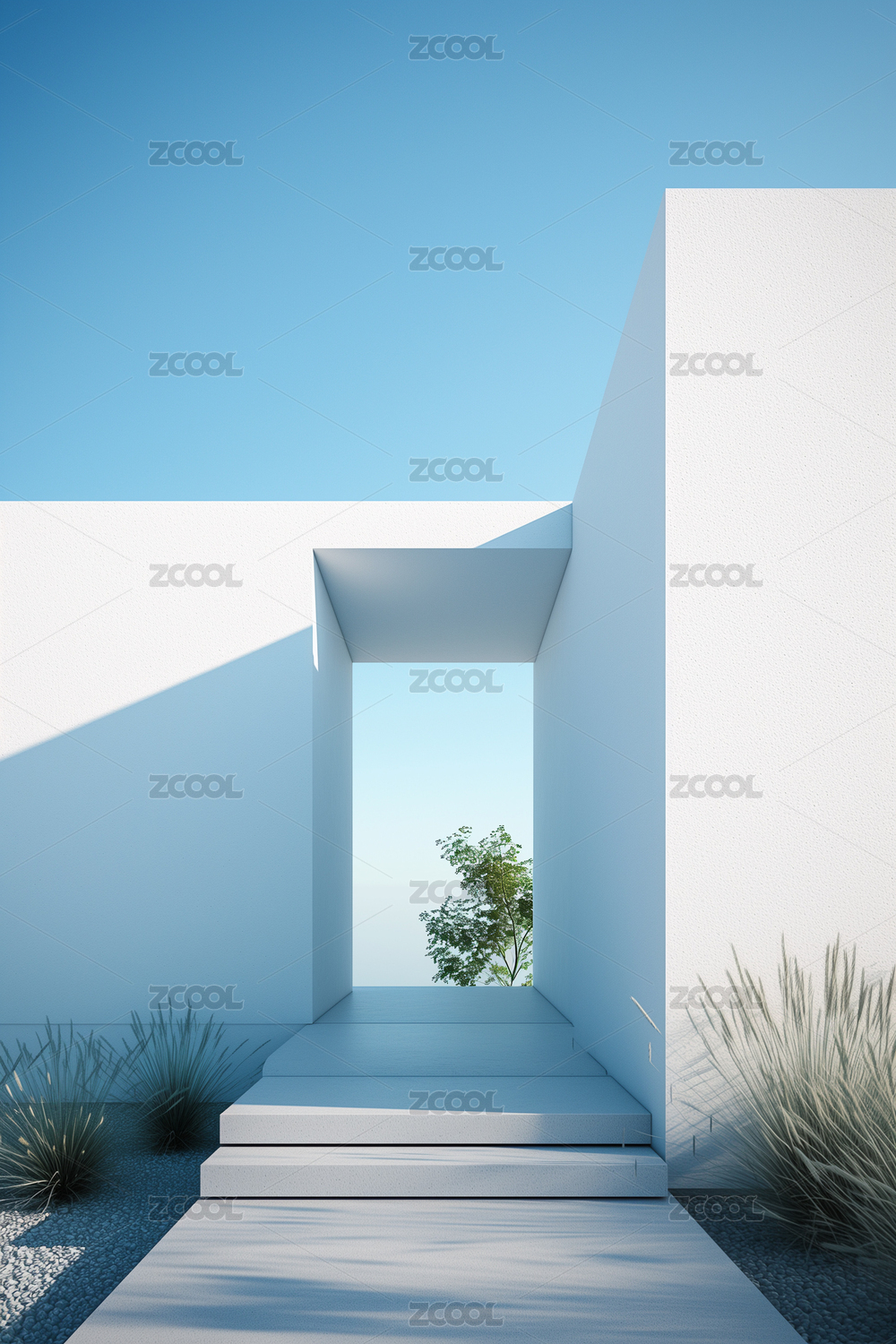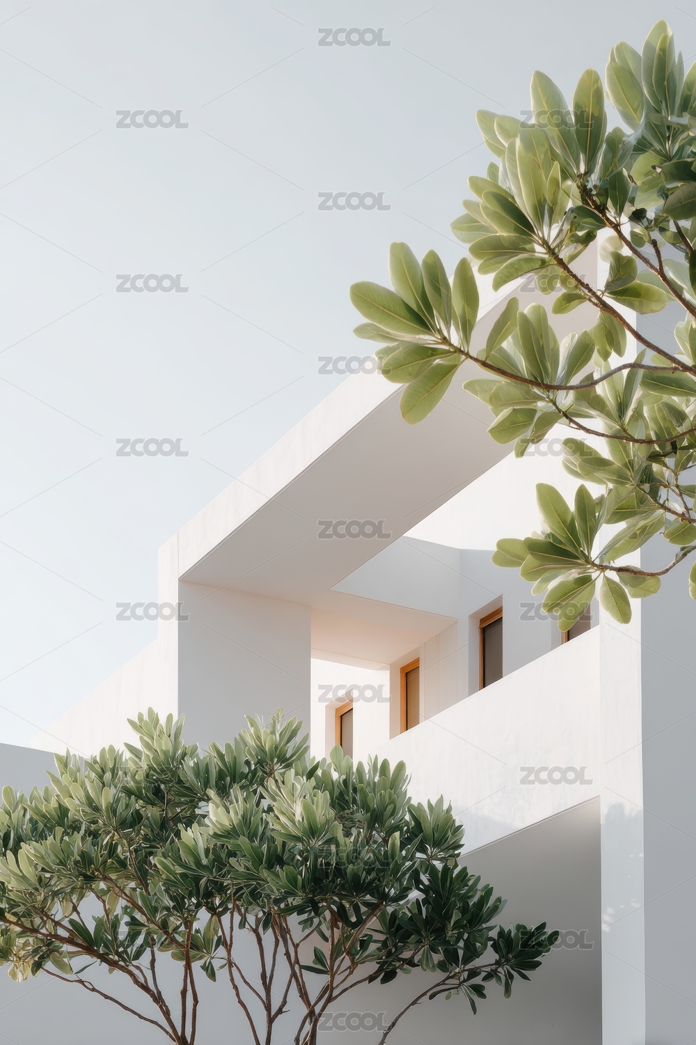 白天清新明亮现代单层别墅建筑局部插画绘画