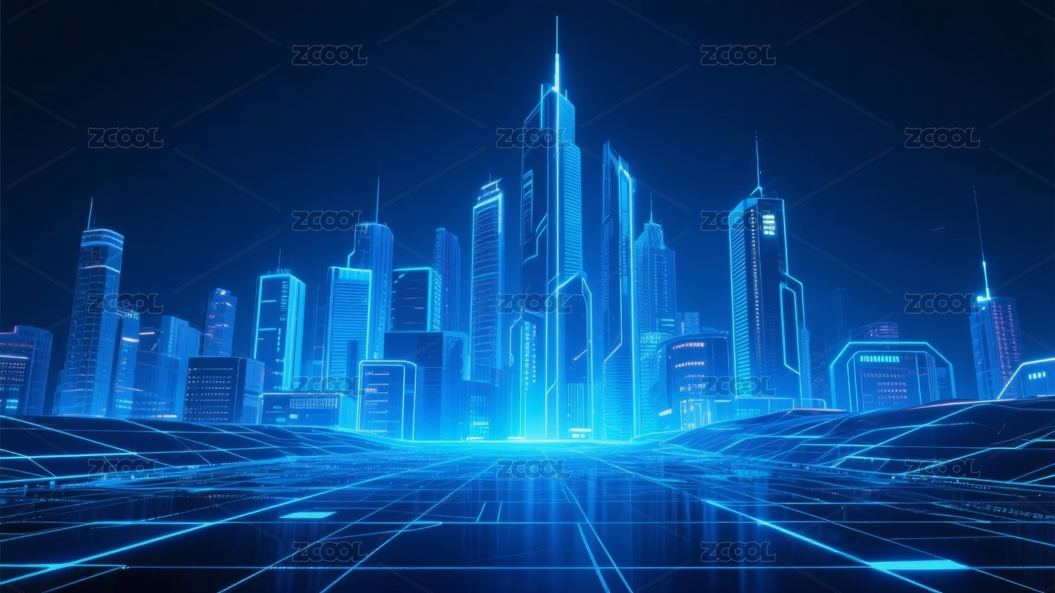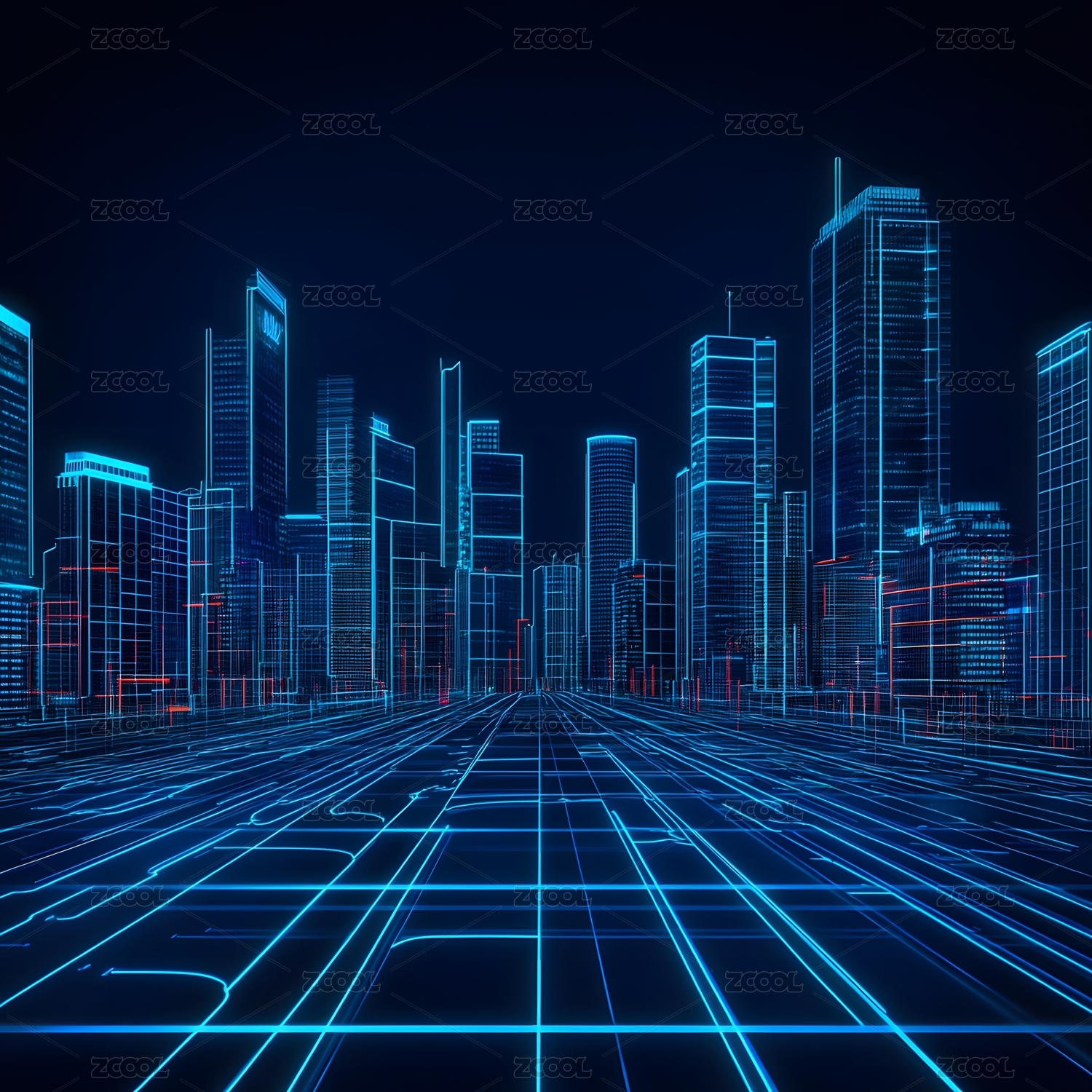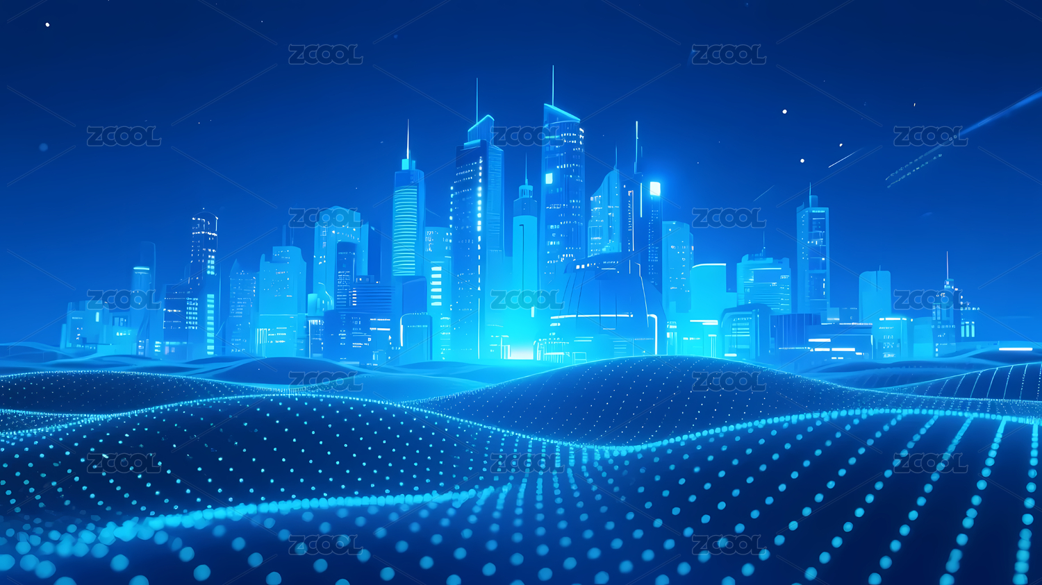 抽象数据流线条发光未来城市轮廓蓝紫色渐变