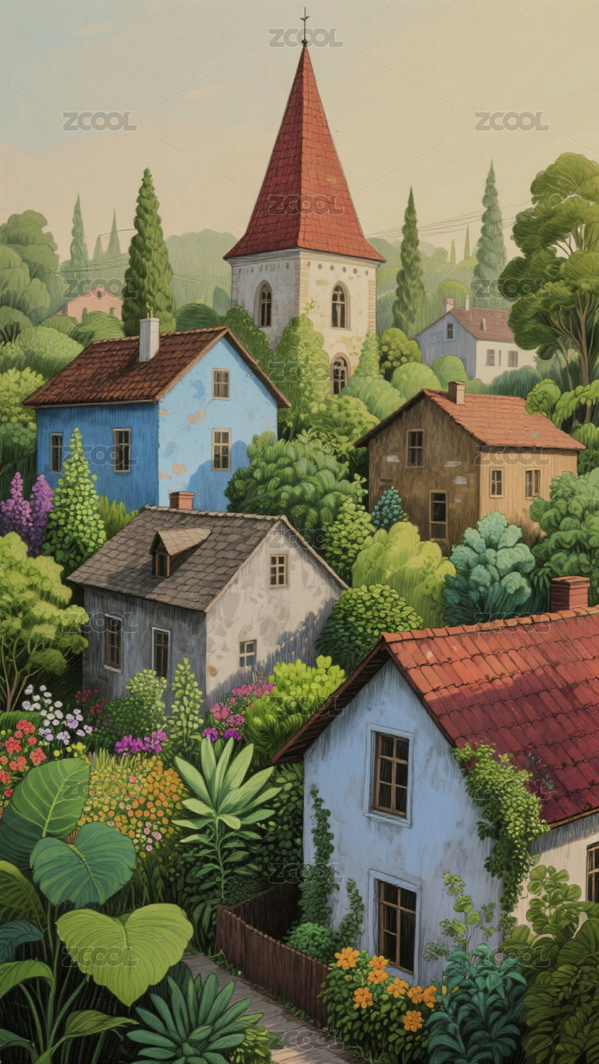 绿植,房屋,蓝红,环绕,画面,唯美,艺术,插画,色彩,斑斓