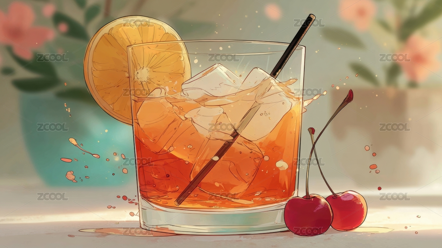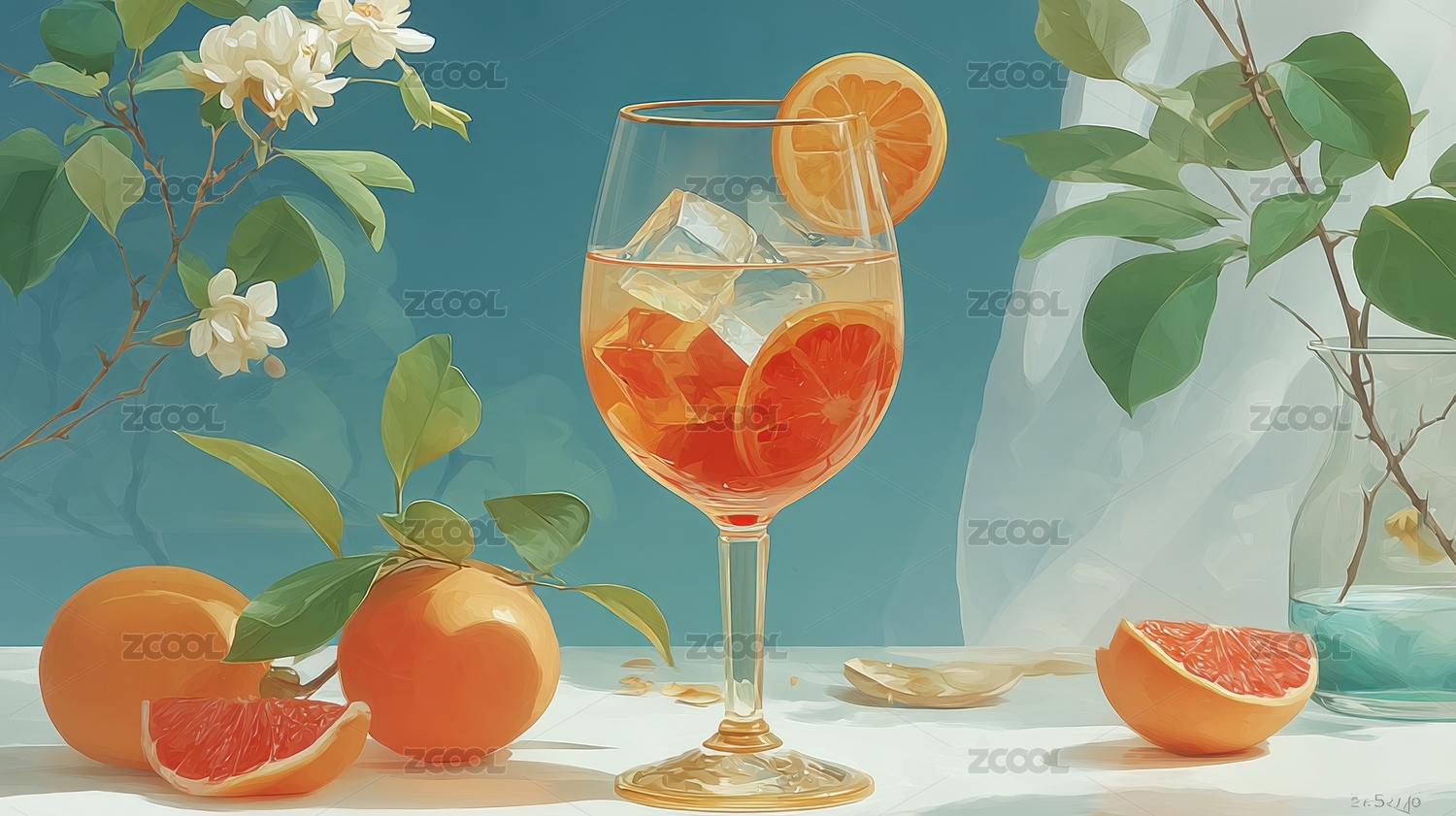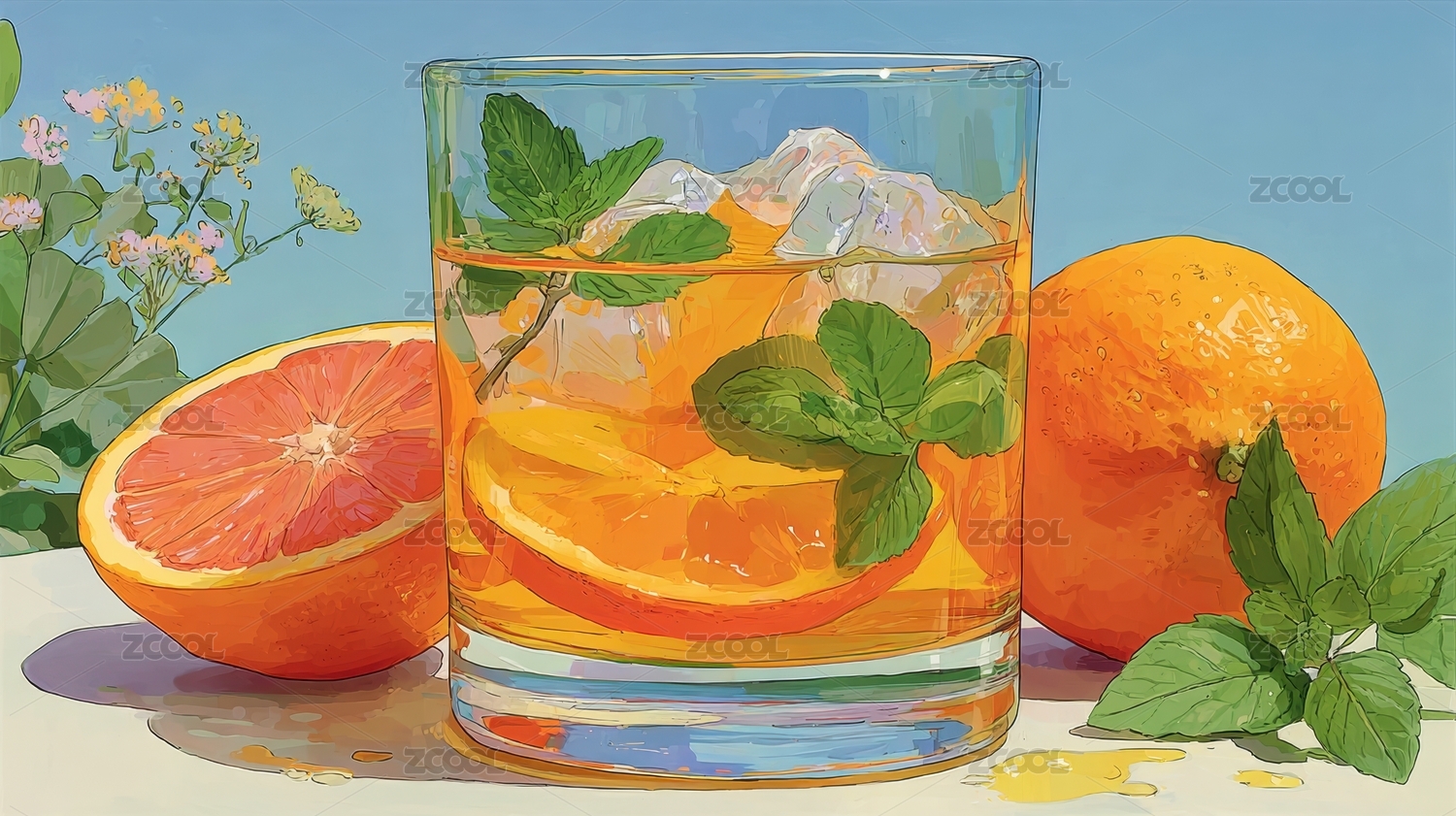 橙子,冰块,绿叶,夏日,清新,水果,饮品,花卉,玻璃杯,果汁