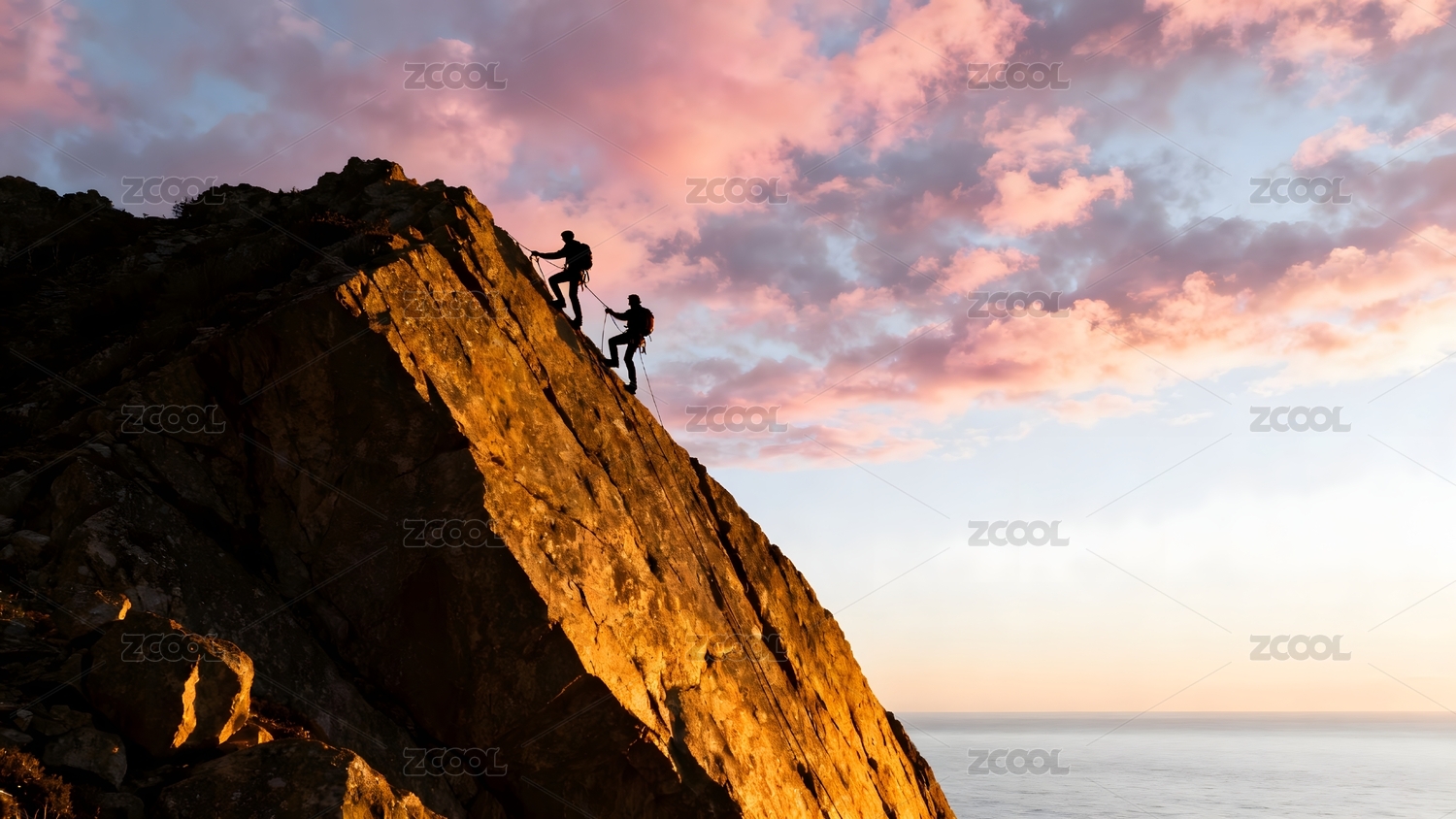 攀岩者夕阳下挑战峭壁