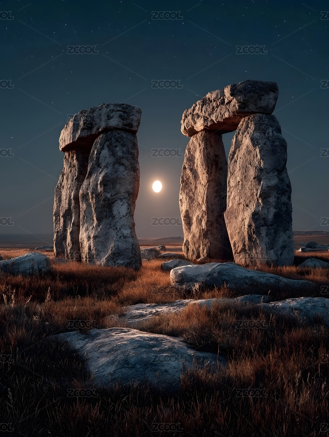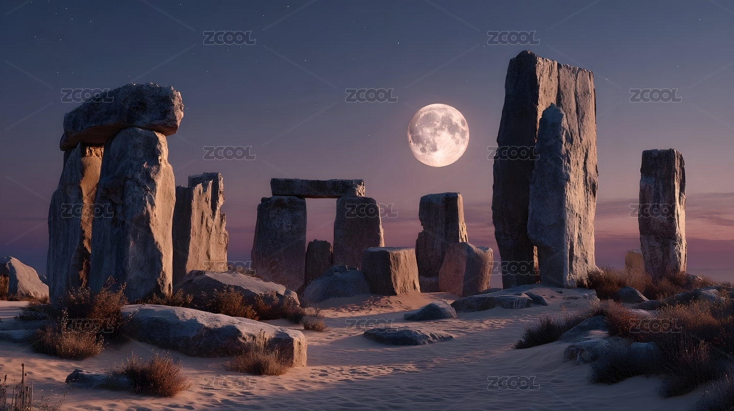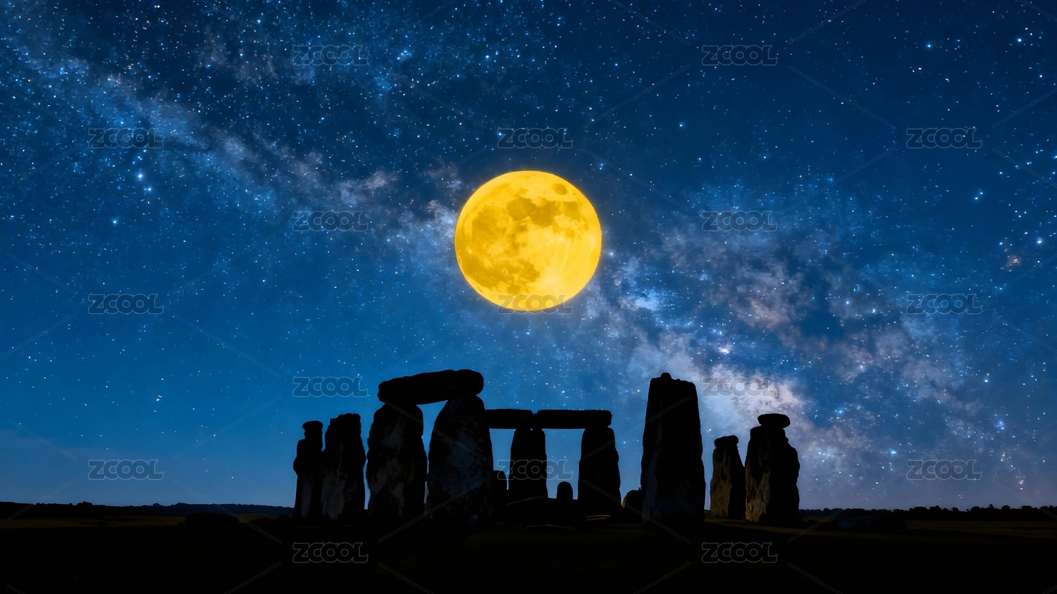 云,石块,石阵,月亮,巨石,星空,夜晚,石柱,银河,圆形
